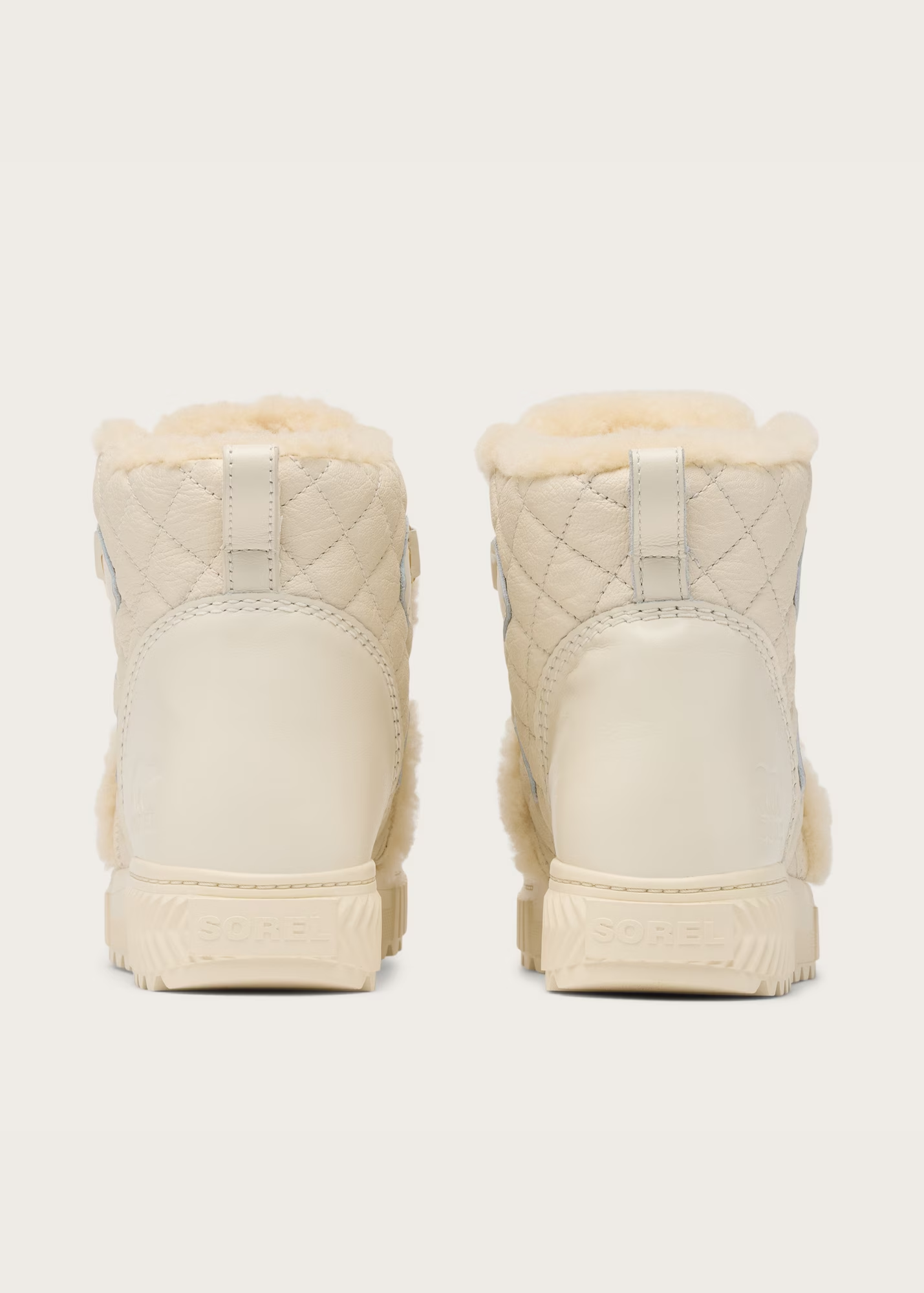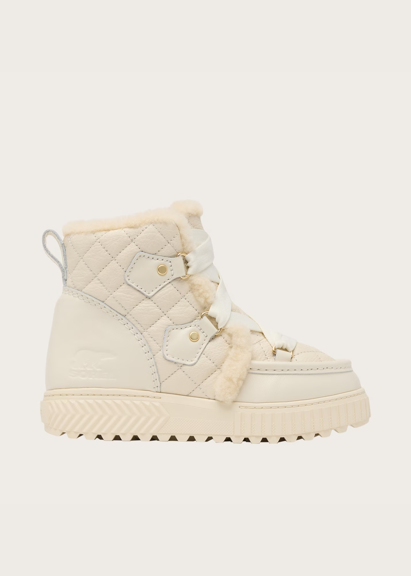 - UPPER: Soft, supple quilted leather in quarter panel, vamp and tongue. Smooth full grain leather in heel and toe overlay. Full grain leather eye-stay with D-ring detail. Genuine shearling trim in collar. Waterproof materials and construction. Laces are not waterproof.