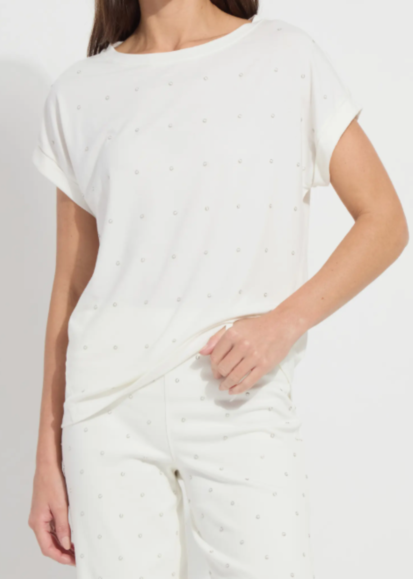 The Lysse Nisha Embellished Jersey Top brings a fresh, elevated twist to your everyday lineup with its faux pearl embellishments that echo vintage glam while feeling decidedly modern. Crafted from a soft stretch-jersey blend, the top drapes with an ease that’s both luxurious and laid-back. Its dropped shoulders and cuffed short sleeves exude an effortless cool, and the high-low hem adds a subtle architectural flair that flatters the silhouette.