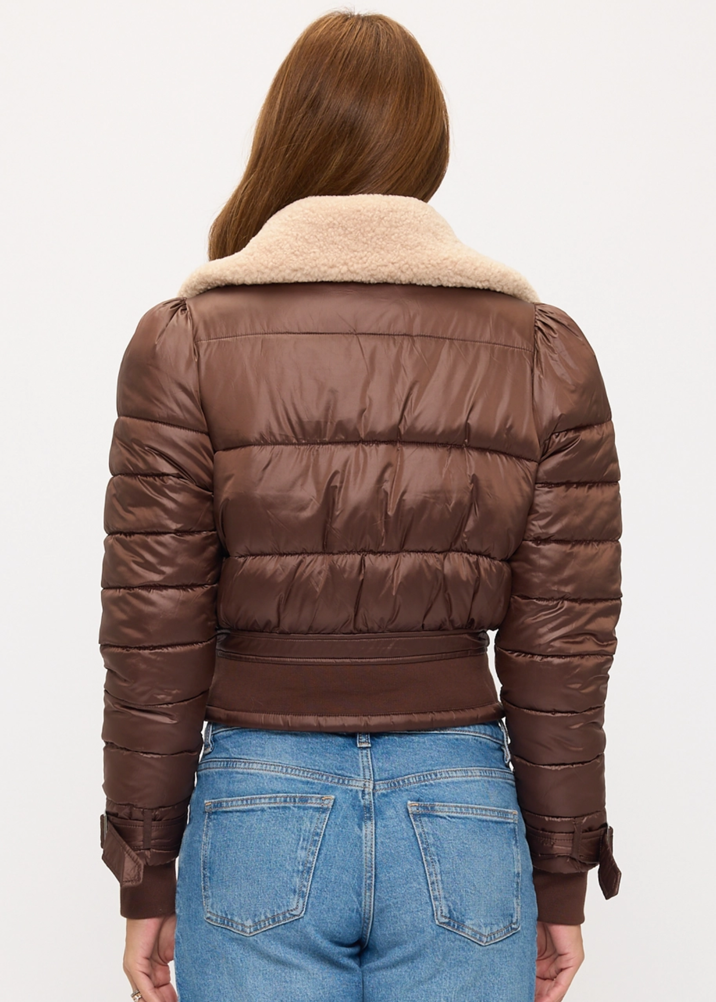 Embrace winter luxury with this striking faux puffer and fur jacket that combines athletic-inspired design with sophisticated warmth. The quilted puffer body provides superior insulation while the plush faux fur collar adds instant glamour and cozy comfort. This cropped silhouette features a flattering fitted cut that accentuates the waist, making it perfect for layering over sweaters or hoodies.