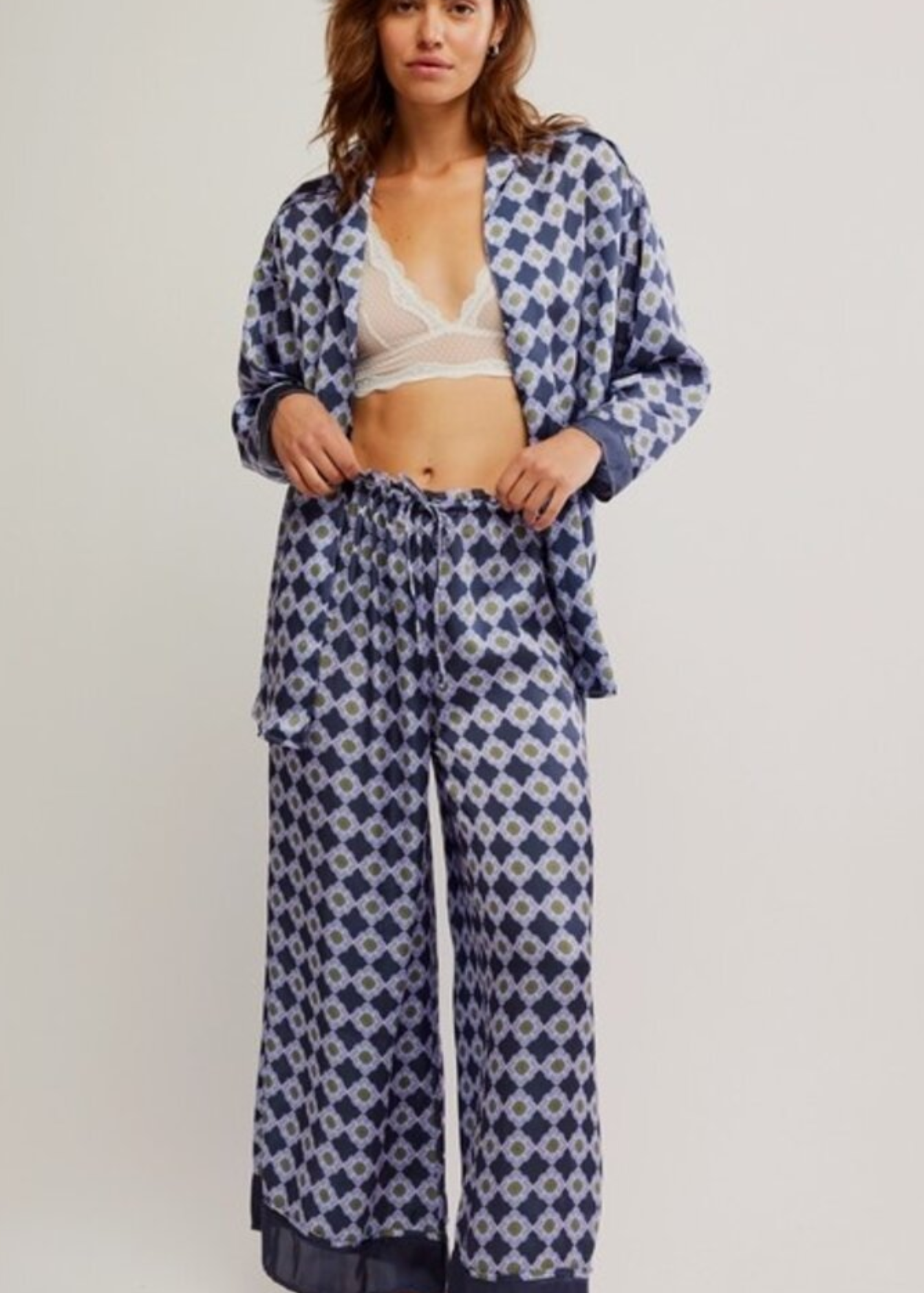 So essential pajama set featured in a soft printed fabrication and oversized silhouette with a long-sleeve top and matching wide-leg bottoms.