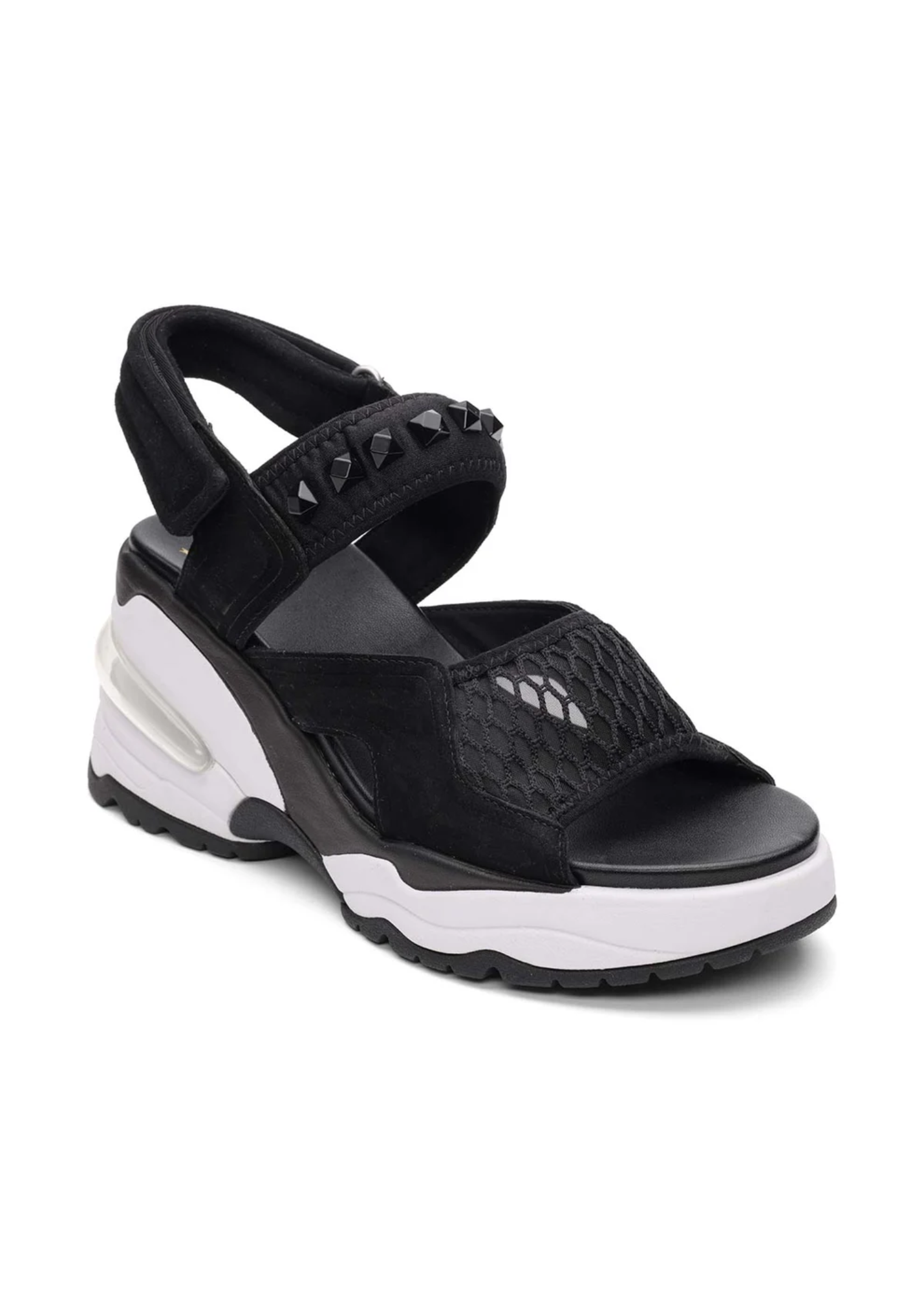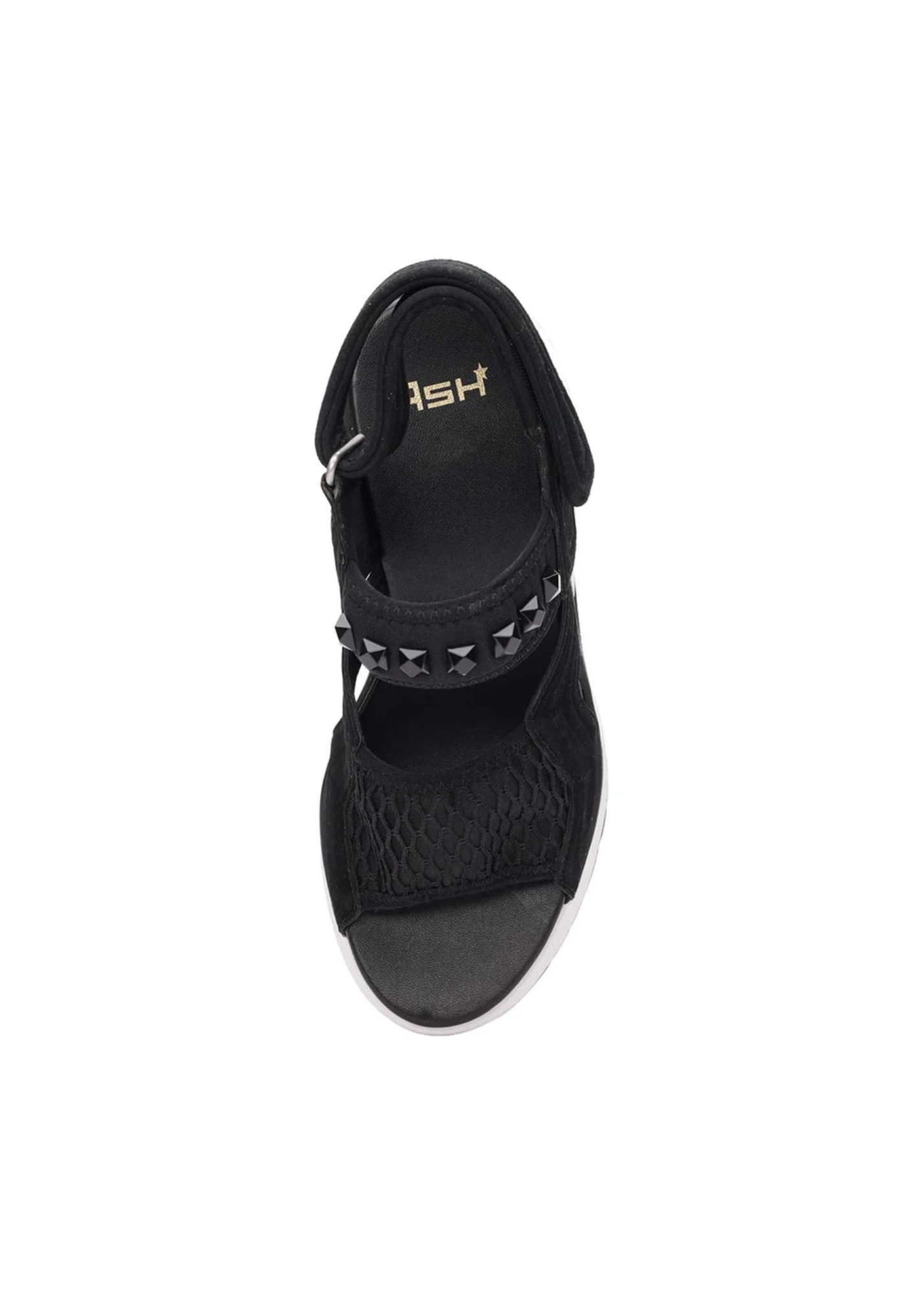 Add a bold touch to your casual wardrobe with the Diva Wedge Sandal. Featuring sleek black mesh and edgy studded straps, this high contrast design offers a perfect blend of comfort and style. The cushioned footbed and supportive wedge make it a versatile choice for everyday wear with a fashion-forward flair.
