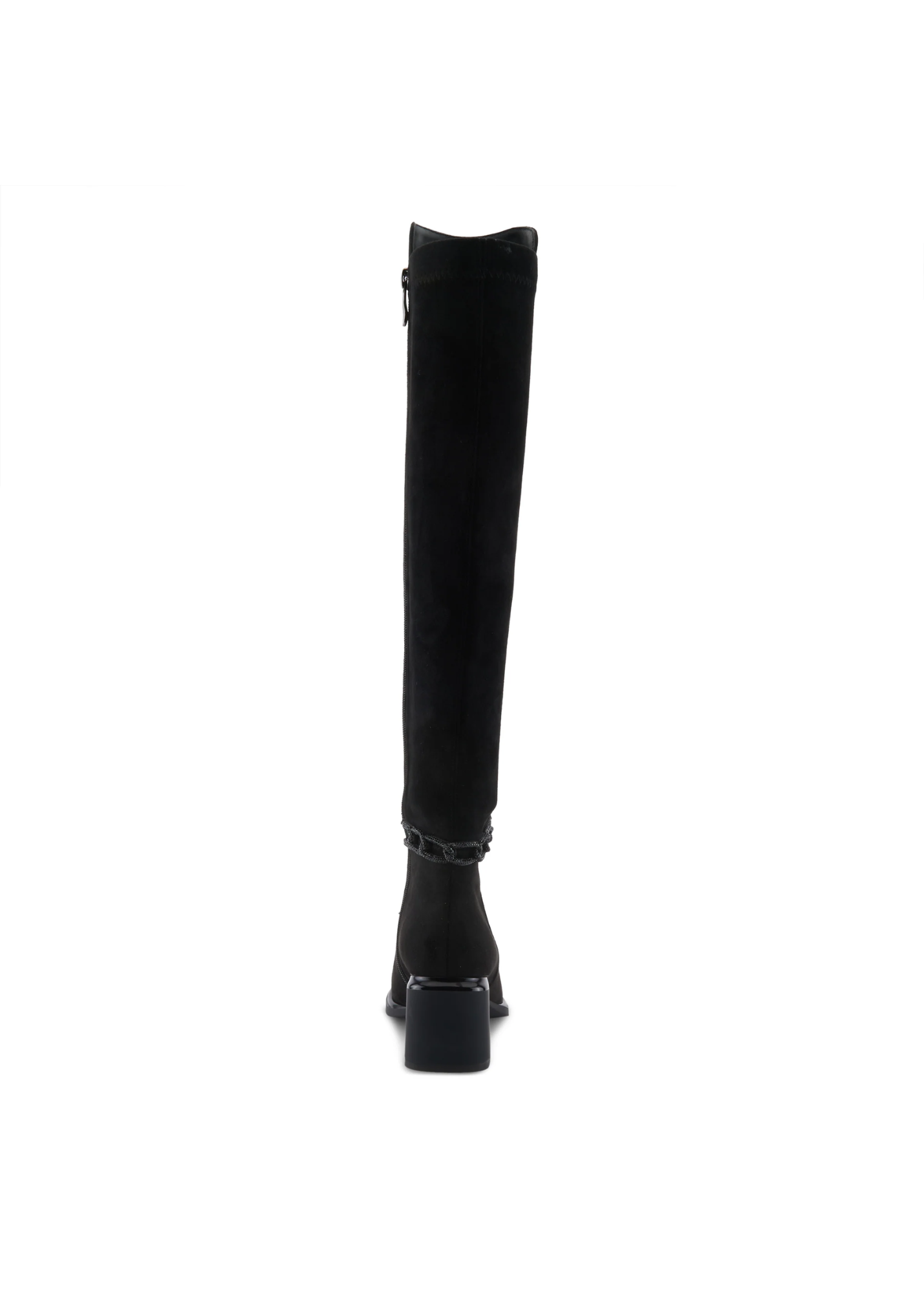 Exude pure elegance and sophistication in this stunning over-the-knee boot, crafted from luxurious ultra-suede for a soft, velvety finish. The sleek silhouette is elevated with a black crystal ankle chain-link design, adding a hint of sparkle and refined detail. Set on a matte black block heel with a patent trim, this boot perfectly balances modern edge and timeless glamour. Whether styled with sleek dresses or tailored pieces, this is the ultimate statement of chic confidence.