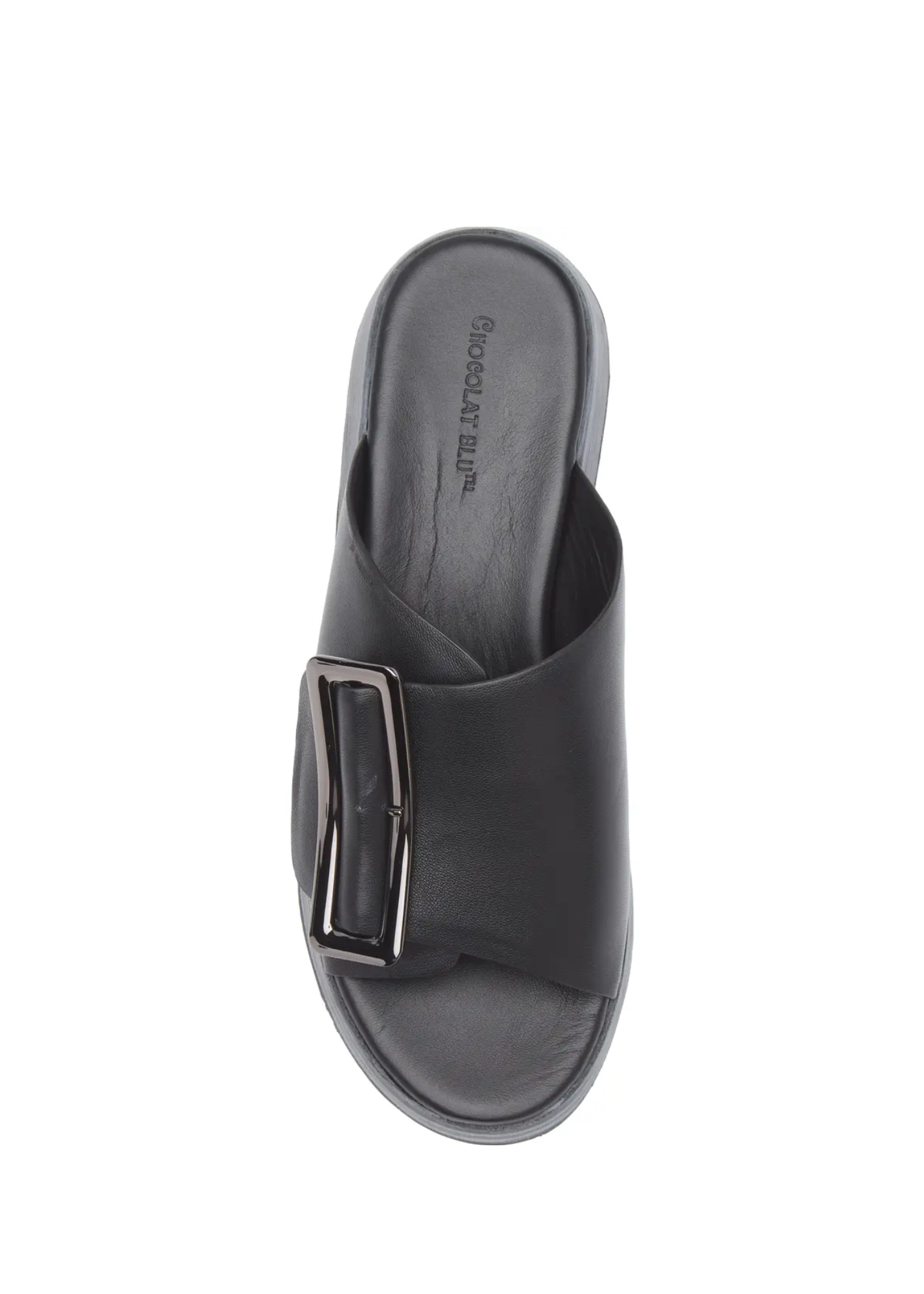 A slender buckle glints against the wide leather strap of a cushioned slide sandal lofted by a stacked platform and integrated wedge heel.