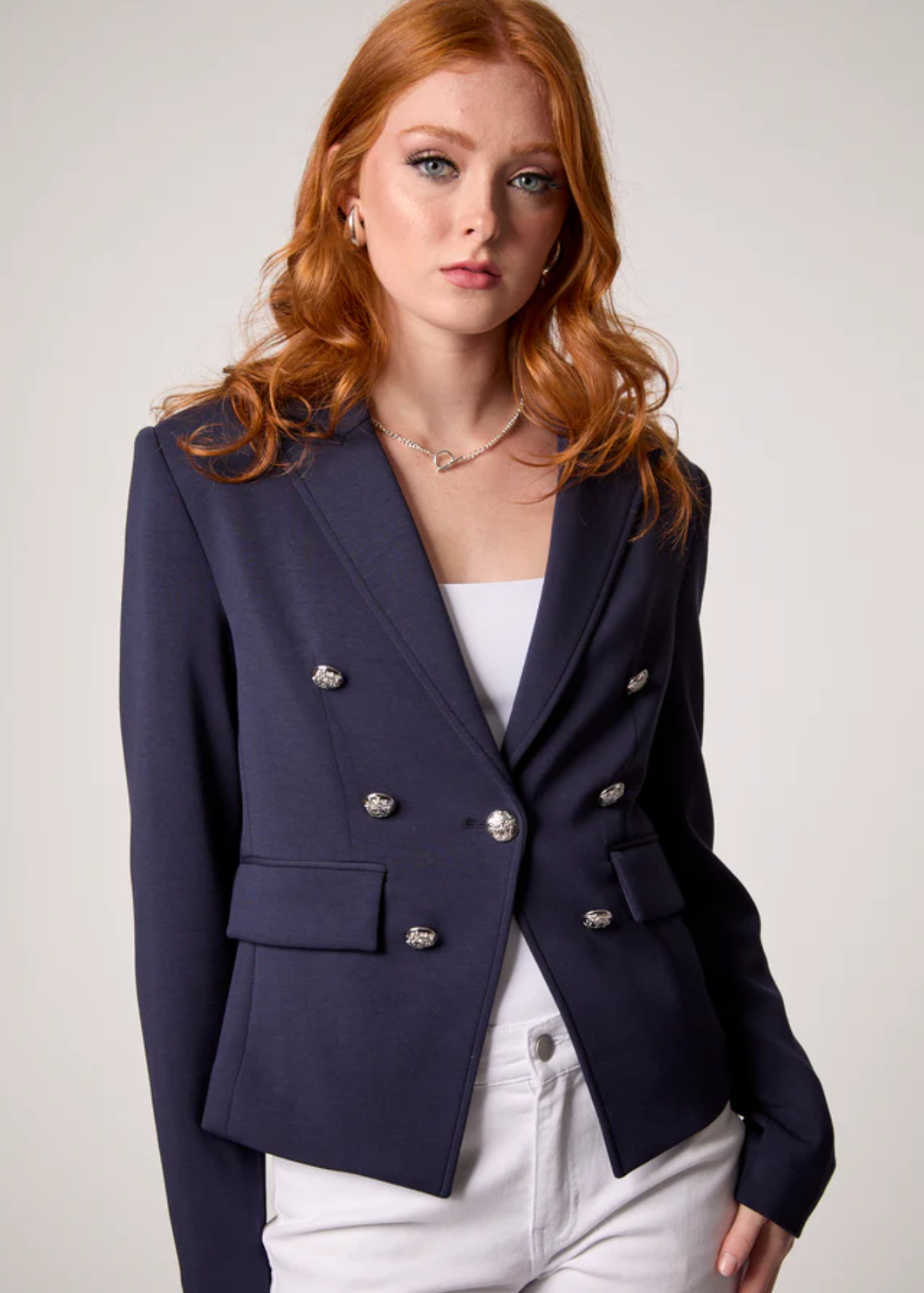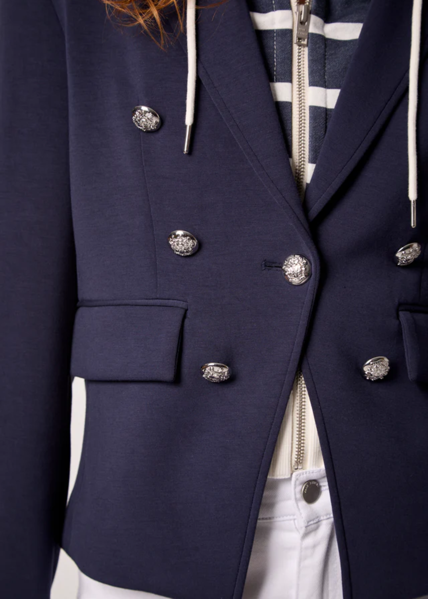 Hamptons-inspired and endlessly versatile, the Kasey Blazer pairs sharp tailoring with a detachable striped hoodie, silver buttons, and front flap pockets.