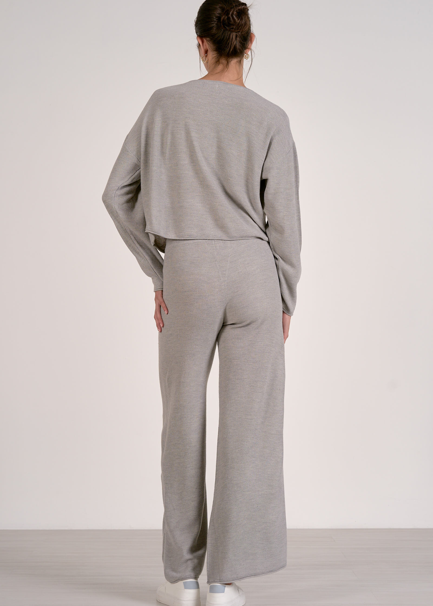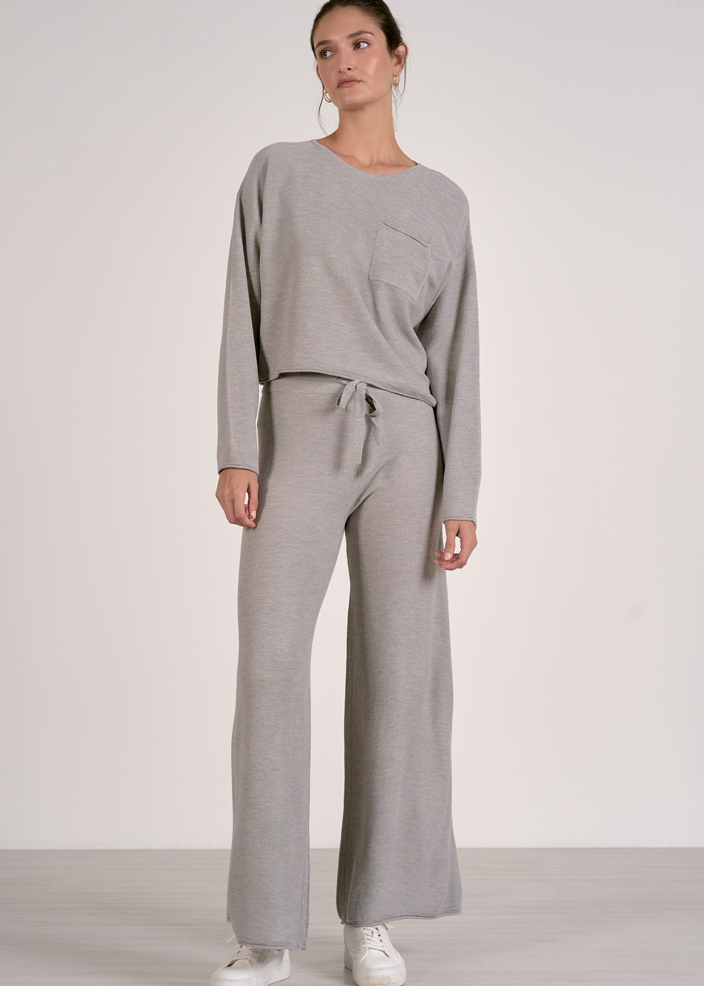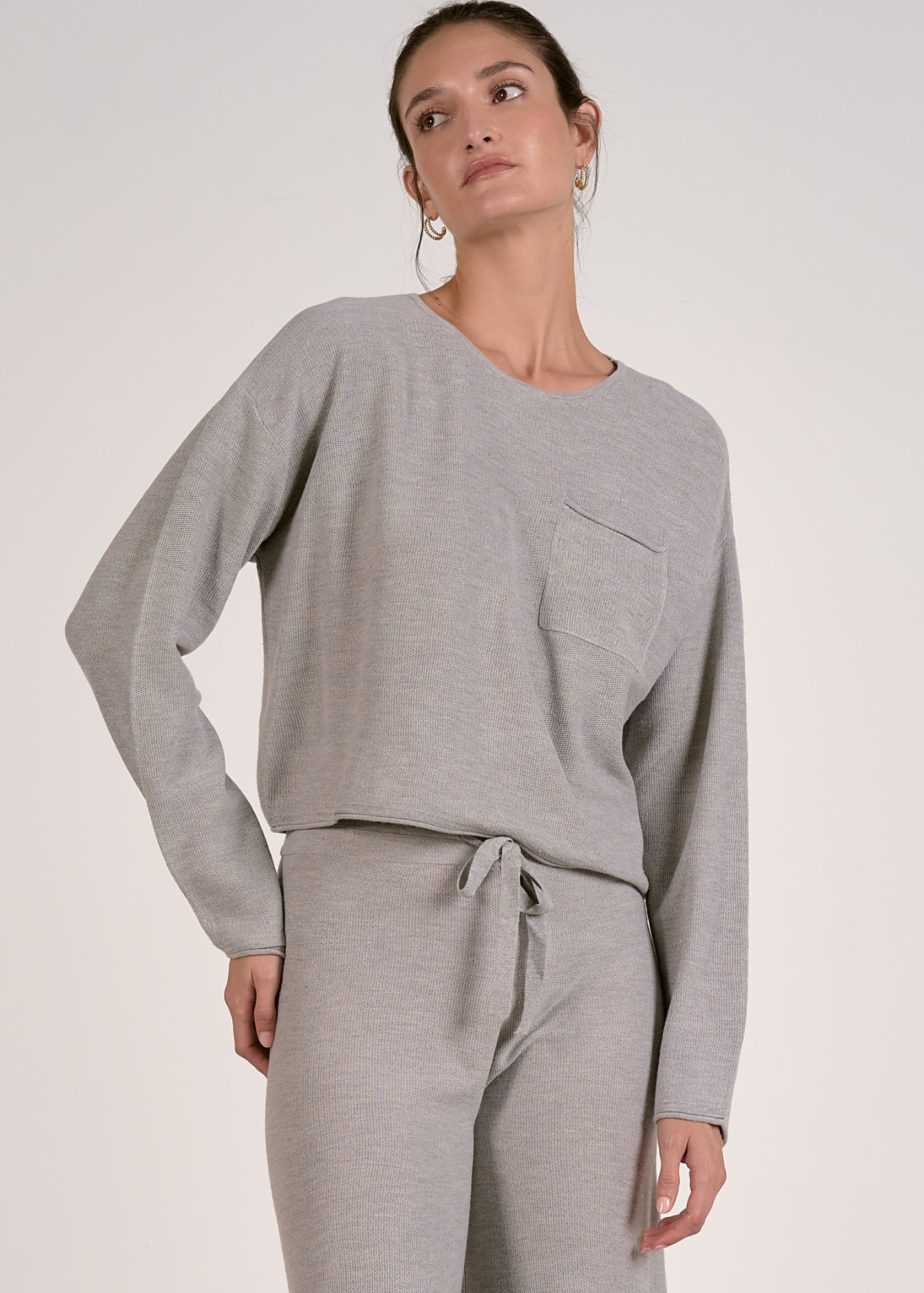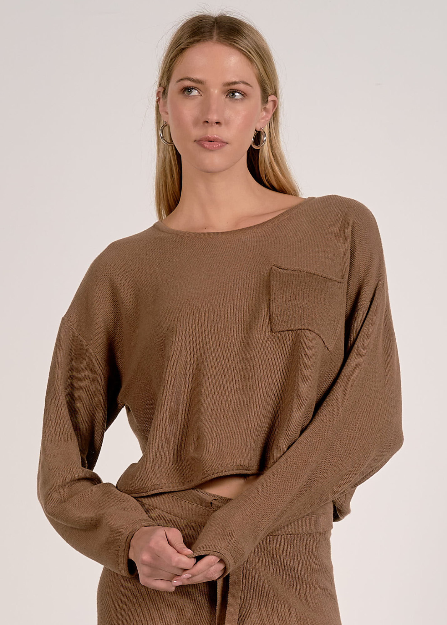 Cozy up in this crewneck sweater featuring a cropped silhouette, long sleeves, and a front pocket for all your essentials. Pair with the Elan Wide Leg Knit Bottoms