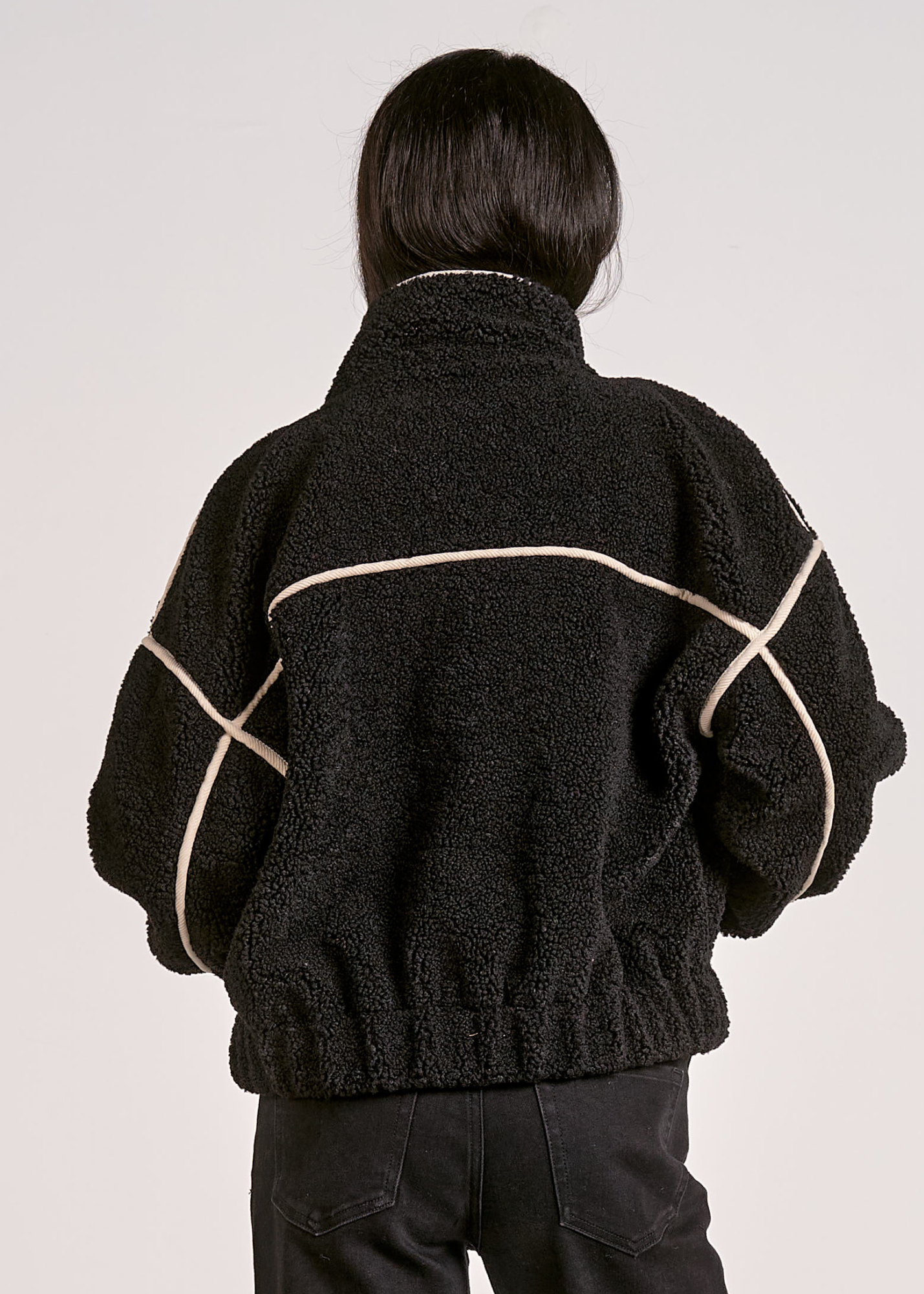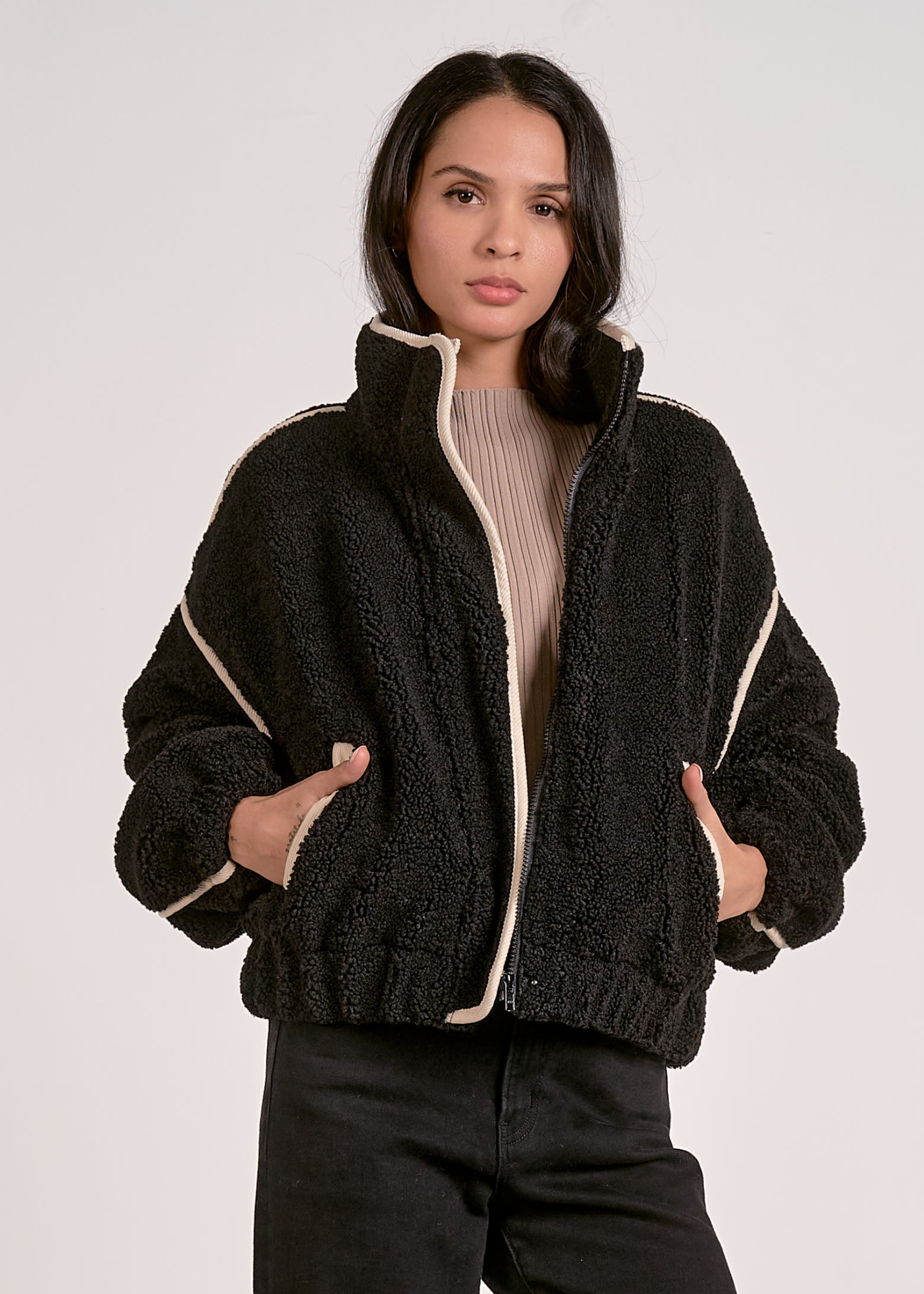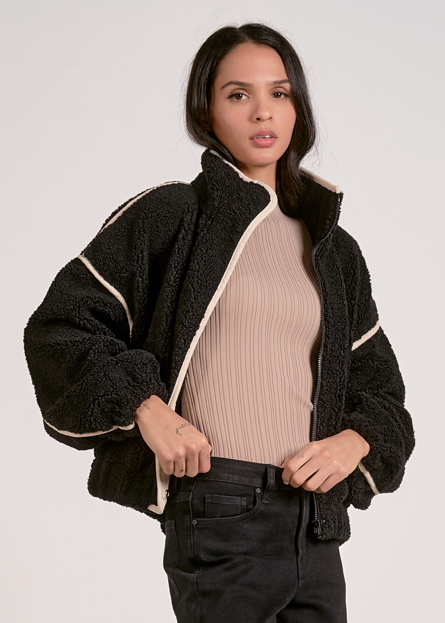 The Slate Bomber brings bold contrast and cozy comfort to your fall wardrobe. With its bomber silhouette and soft shearling panels, this zip-front jacket makes a statement while keeping things warm. Layer over a sleek knit or pair with a wide-leg denim for an effortlessly cool outfit.