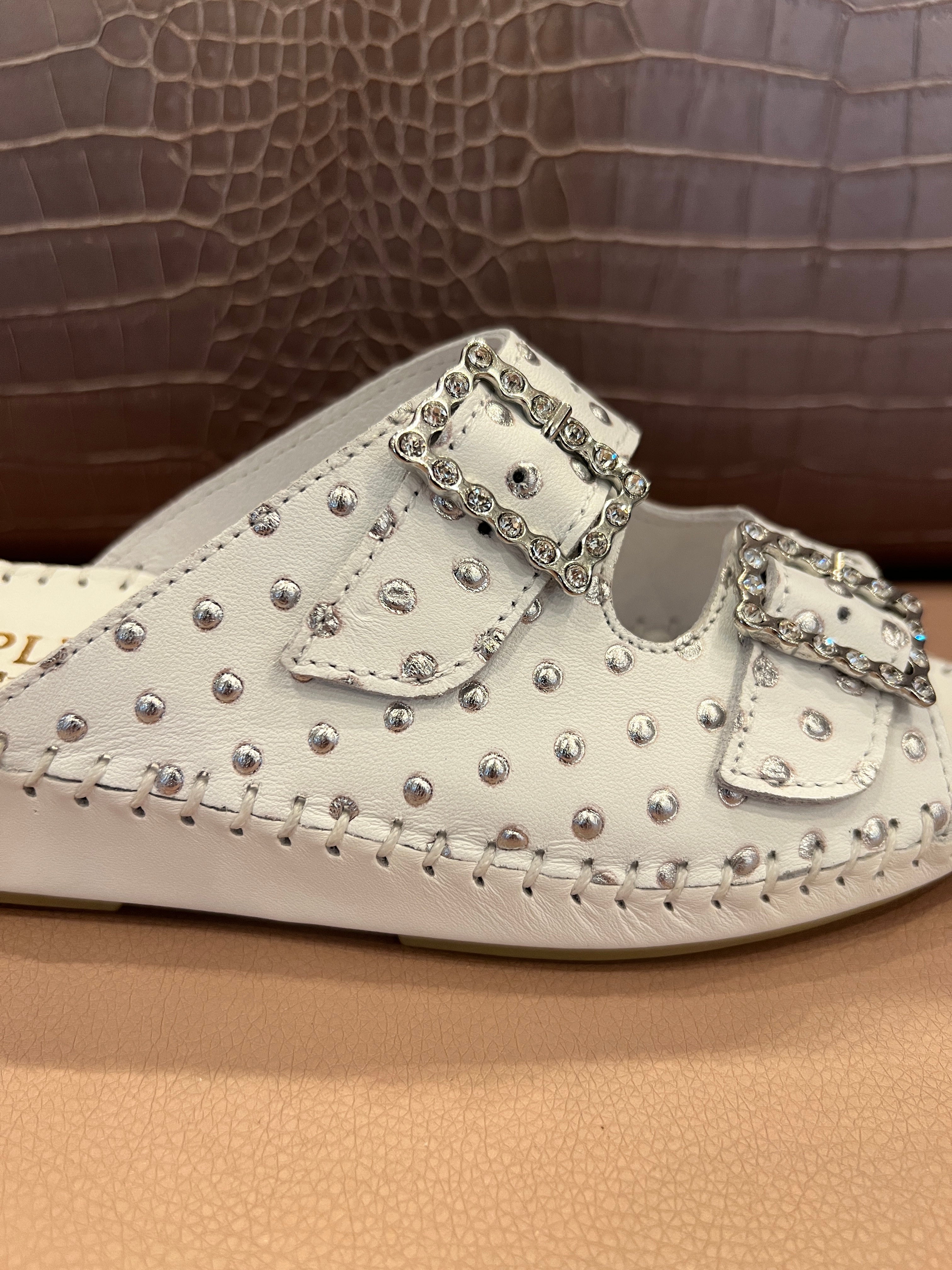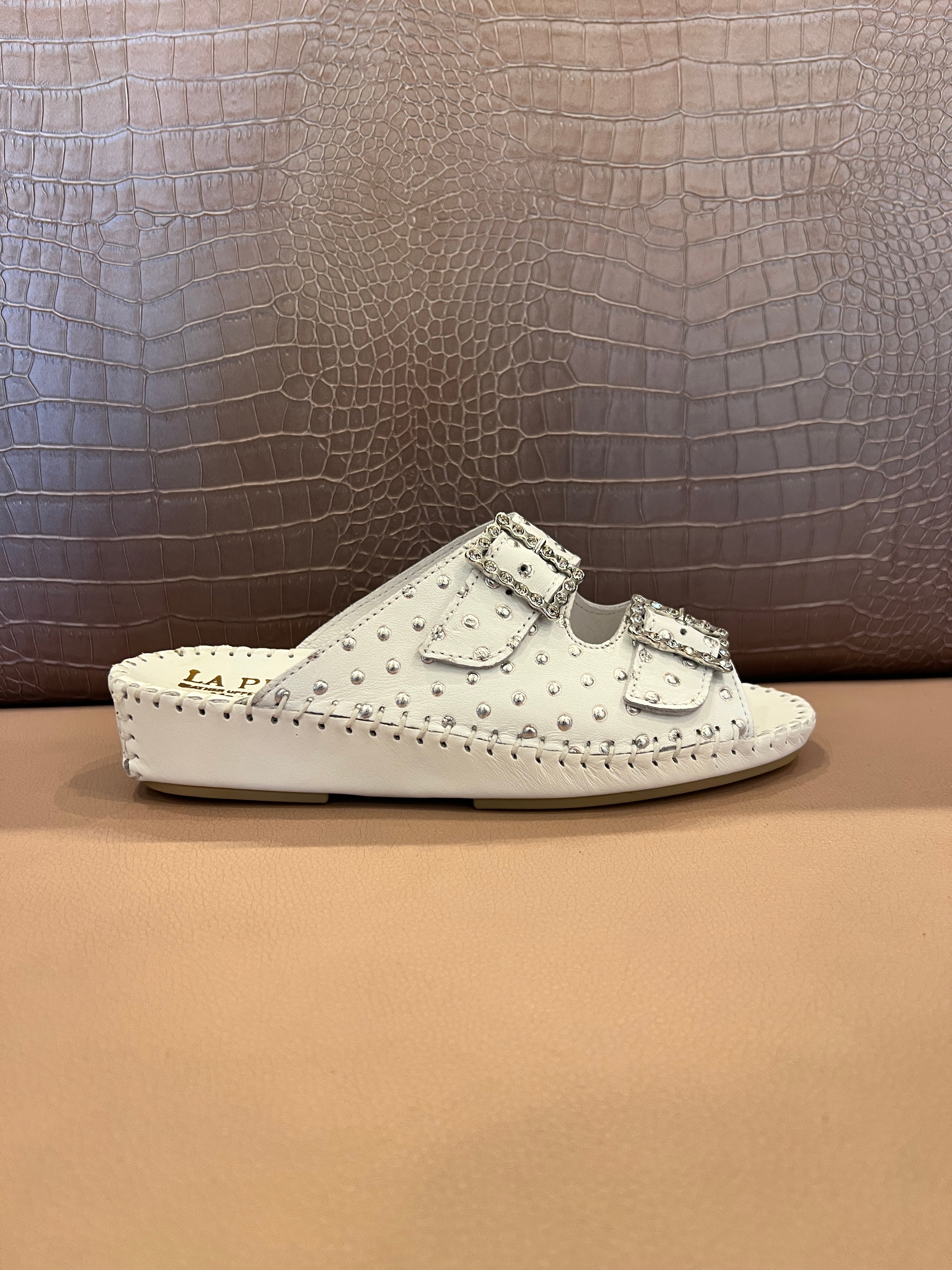 Indulge in the timeless elegance of the La Plume Jen, handcrafted in Italy from the finest leather and suede for superior quality and comfort. This elegant open-toe slide sandal boasts a striking classic beauty with a unique pattern and color, adding a touch of sophistication to any outfit!