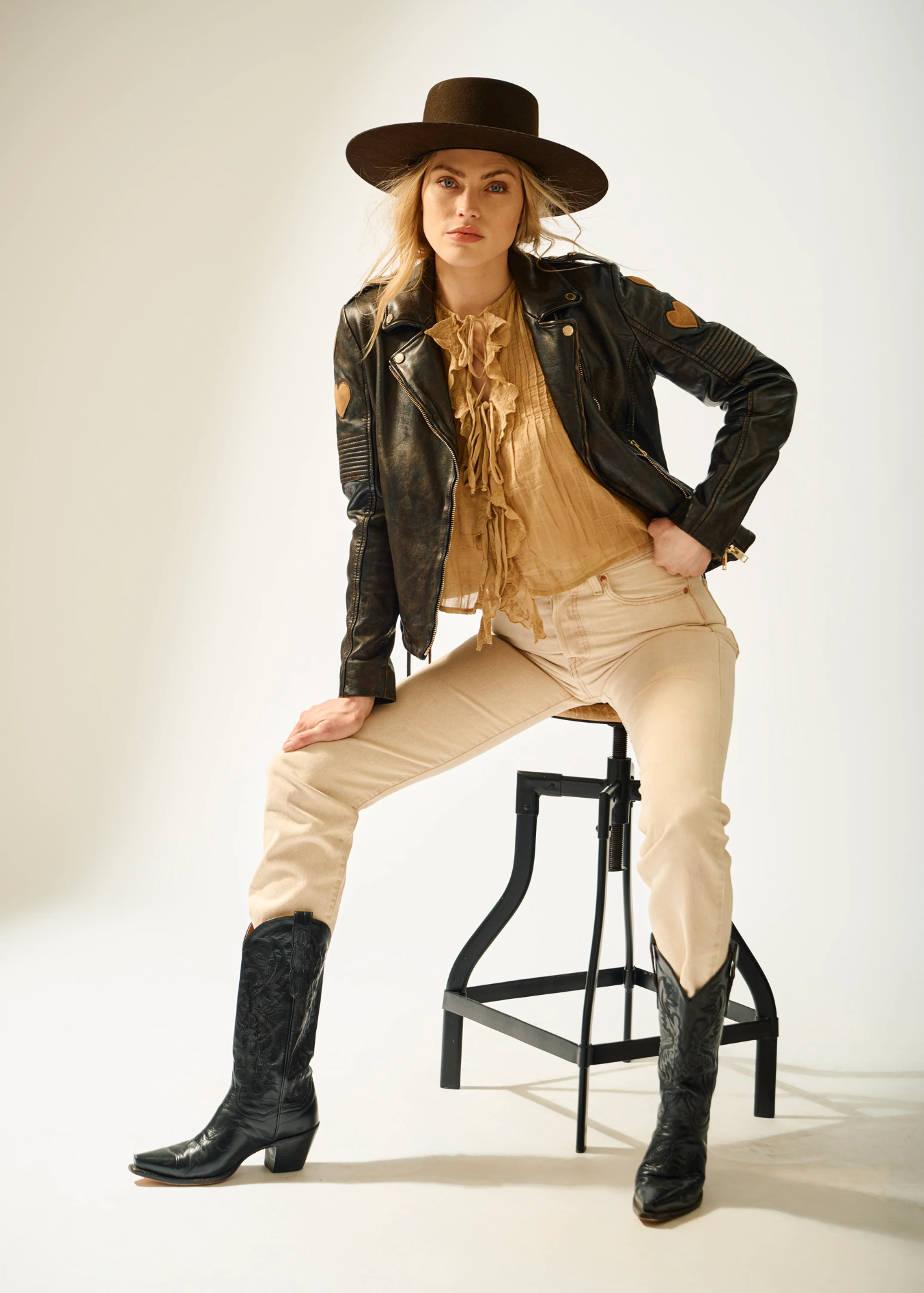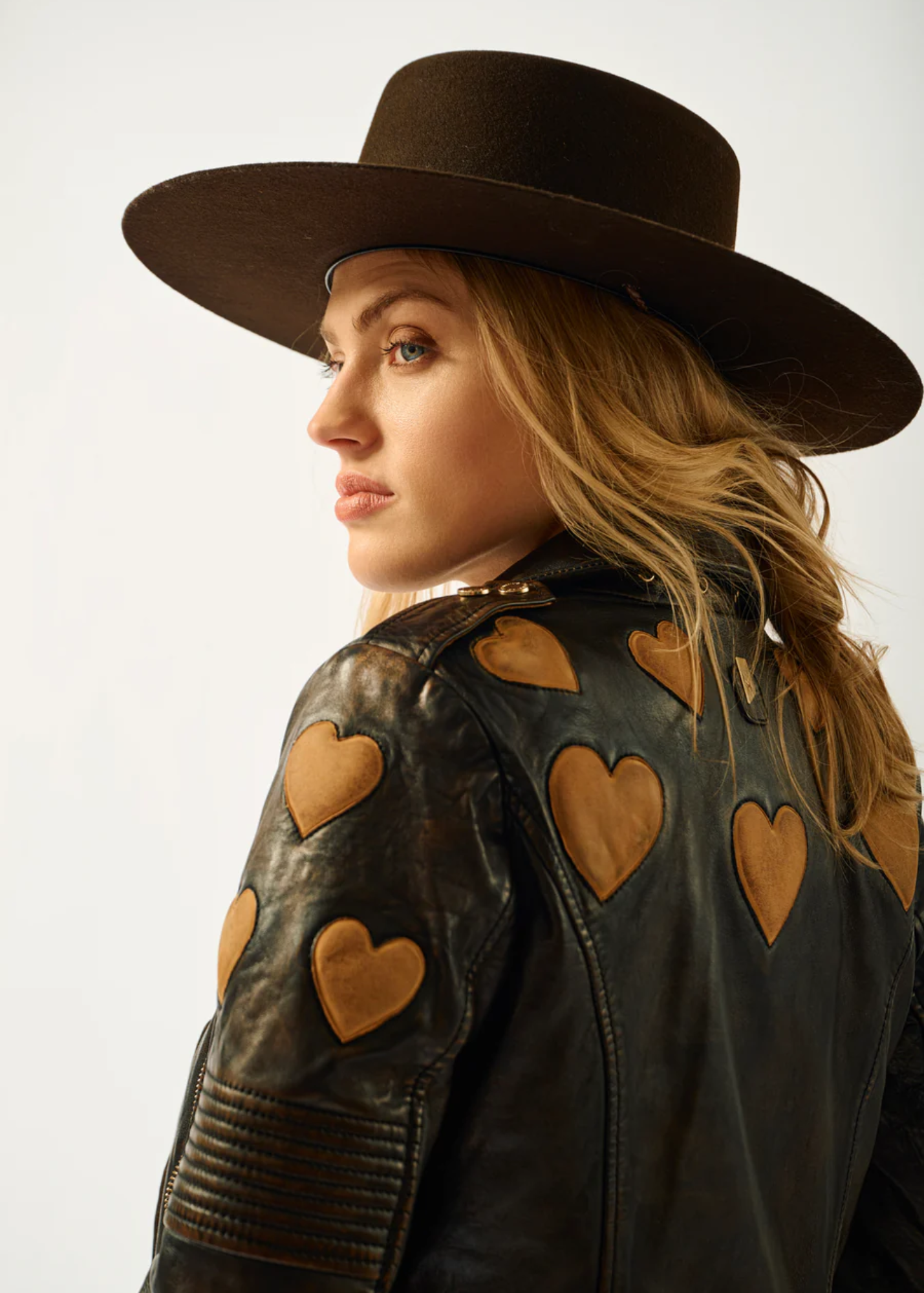 Fall for the Reo Heart Detail Jacket! Made from high-quality lambskin leather, this moto-style piece features subtle heart accents on the back and shoulders for a playful twist on a classic look.