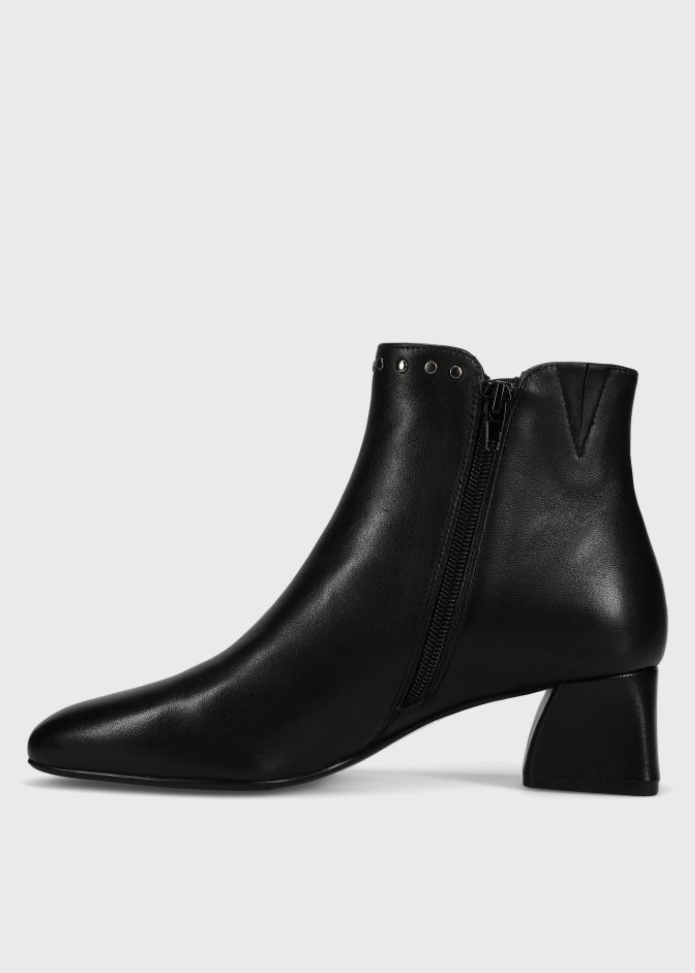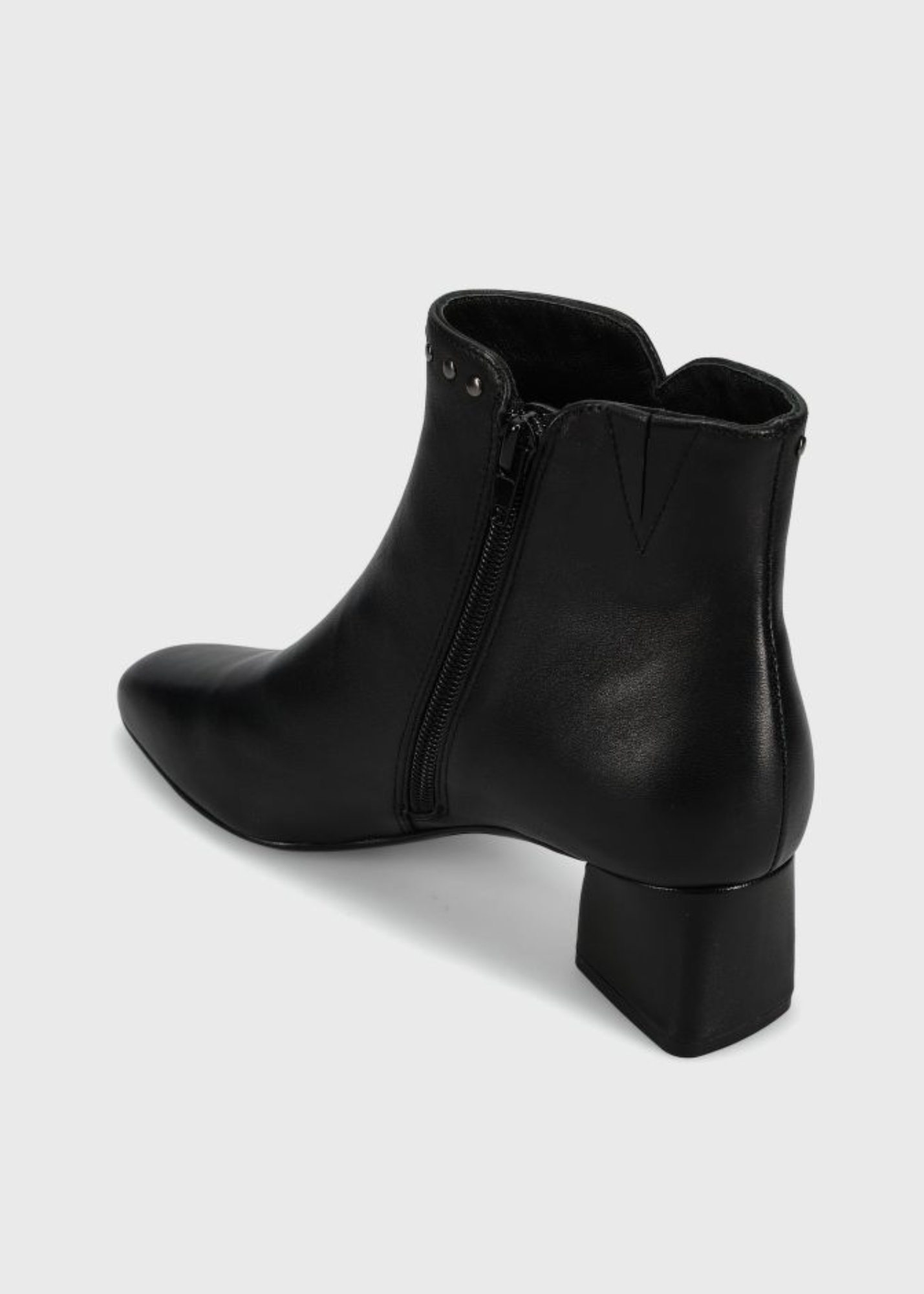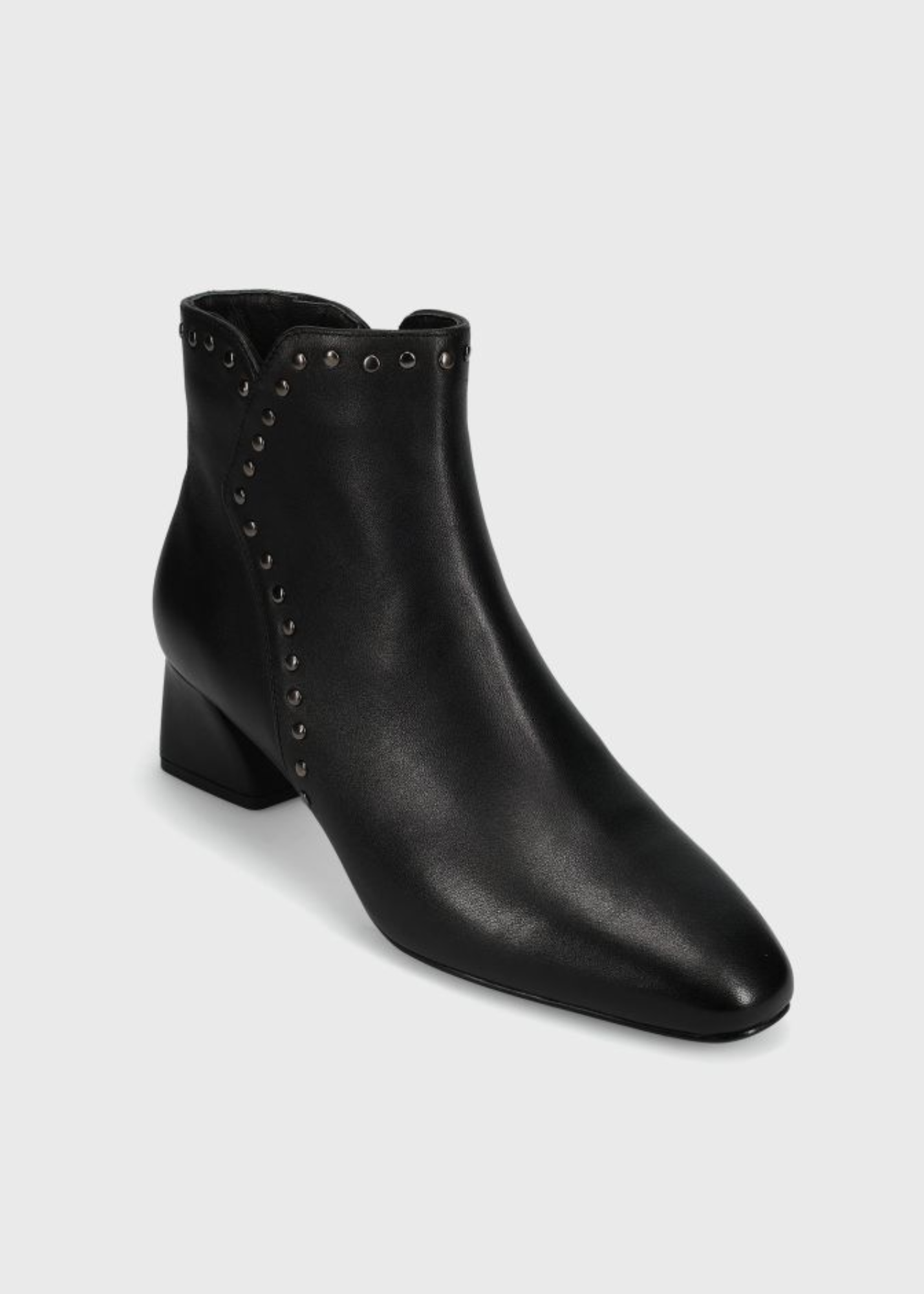 Almond-toe ankle boot. Side zip. Studded topline and outer quarter. 1.75 inch covered sculpted heel.