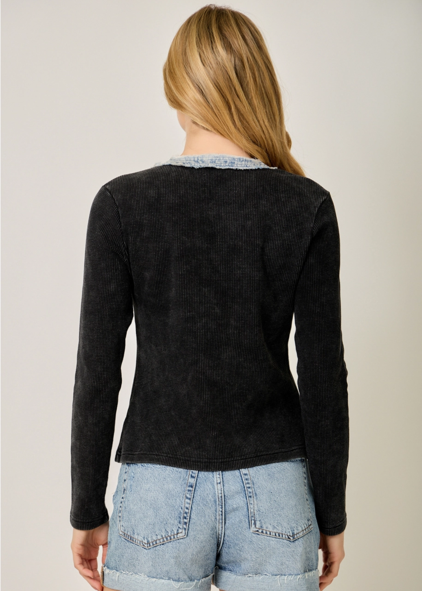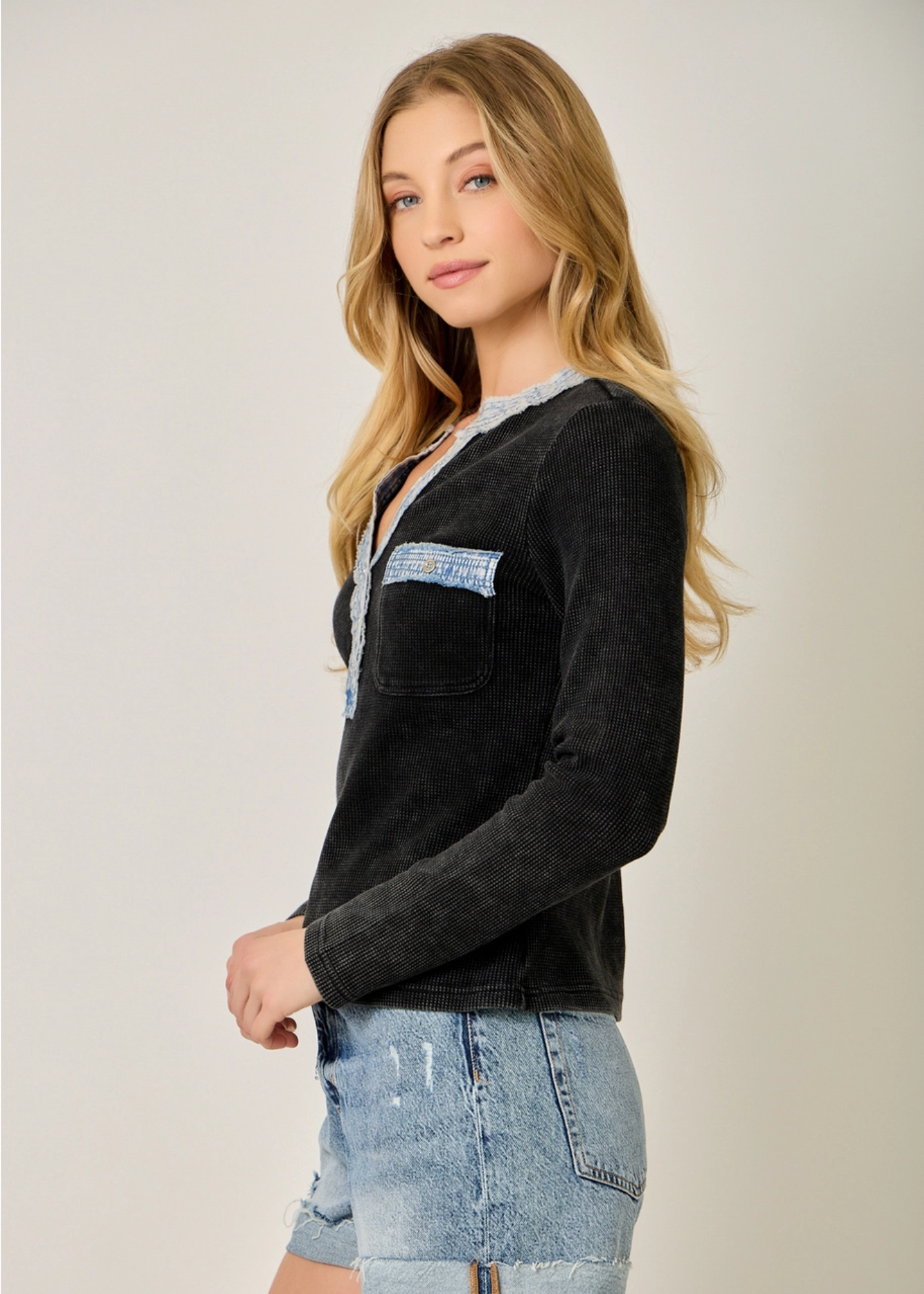 Denim Mixed Henley Top Button trim V-neckline Chest pocket Long sleeves -Model wears: S / Model height: 5` 9"