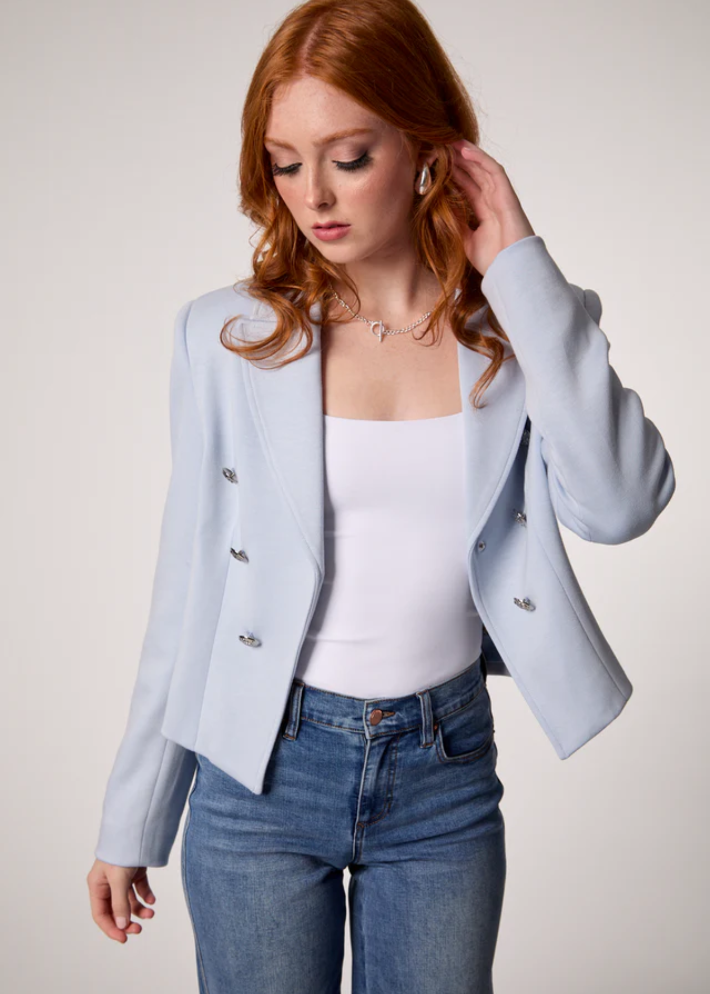 Tailored to turn heads, the Charlotte Blazer pairs a soft baby blue hue with statement silver buttons and a secret lining you’ll want to flaunt.