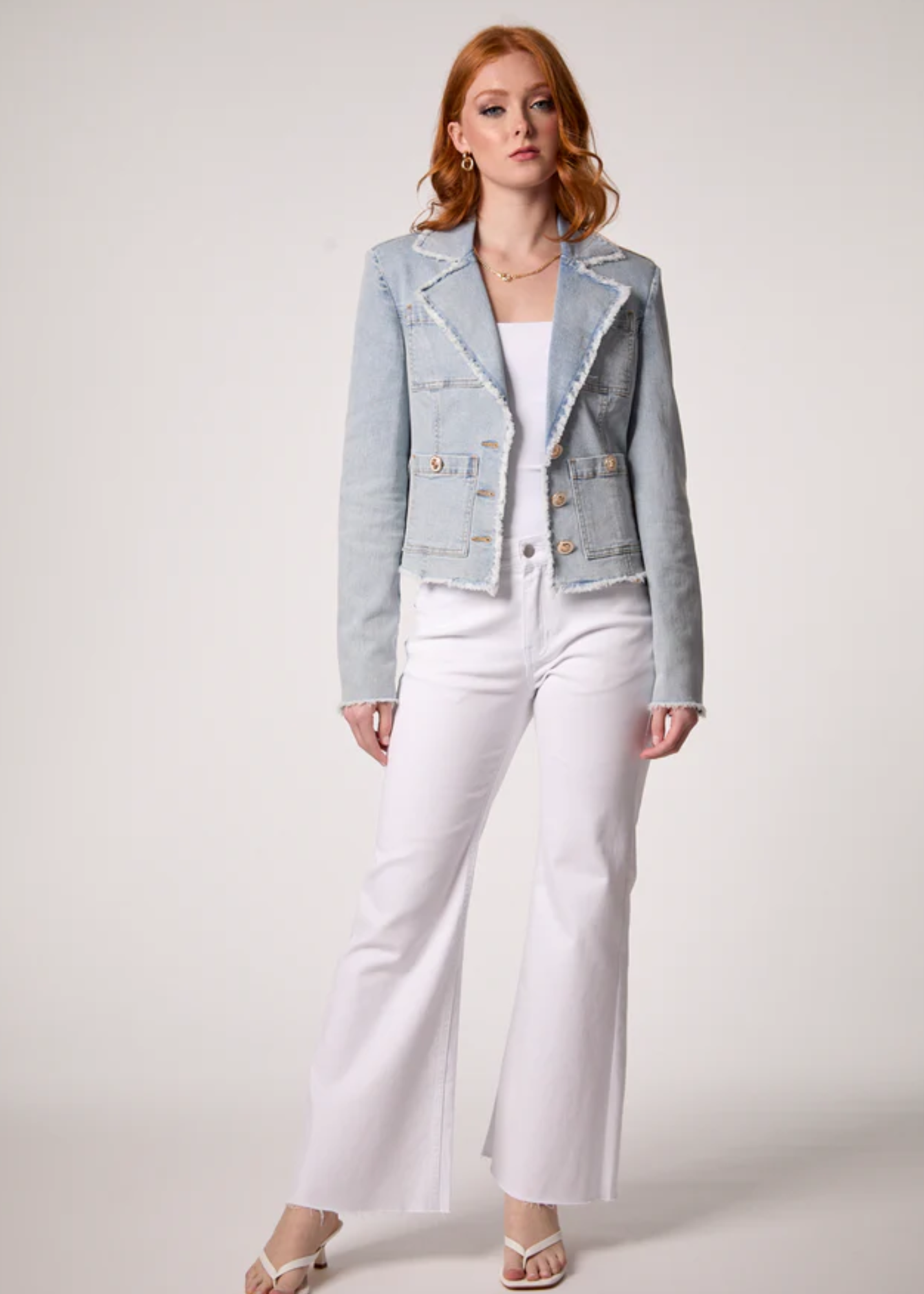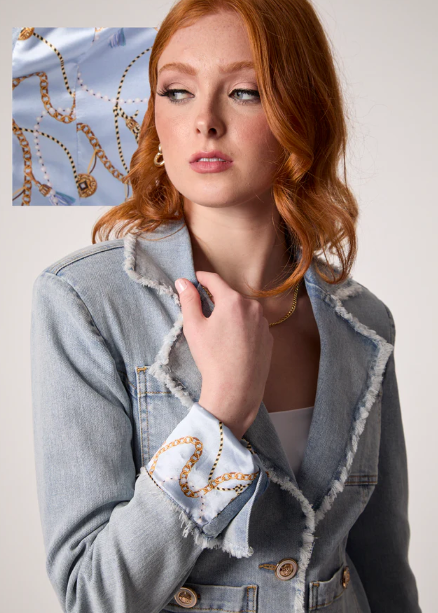 fresh spin on the denim blazer with rich gold hardware, a three-button front, and interior details that steal the show.
