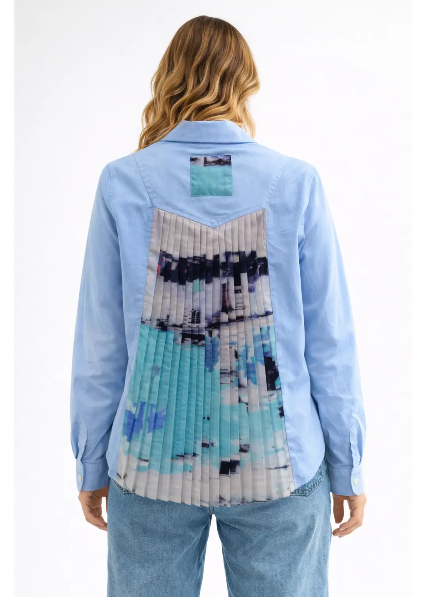 The Caroline Top is a classic button-down top with a collared neckline and long sleeves, featuring a clean front and a unique pleated back panel with an abstract print detail. Finished with a relaxed fit for an easy, polished look from the front and statement in the back.