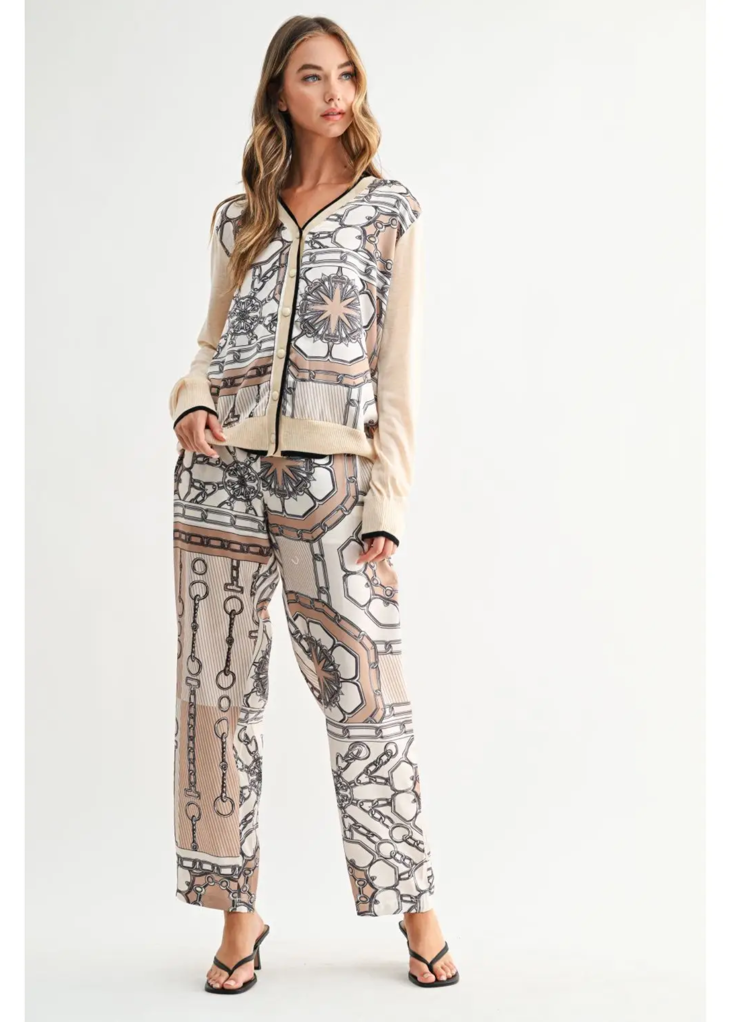 The Jerry Pants are a relaxed straight-leg pants crafted from a lightweight, satin fabric. Designed with an elastic waistband and an allover luxury chain-inspired print for a polished yet comfortable everyday look.
