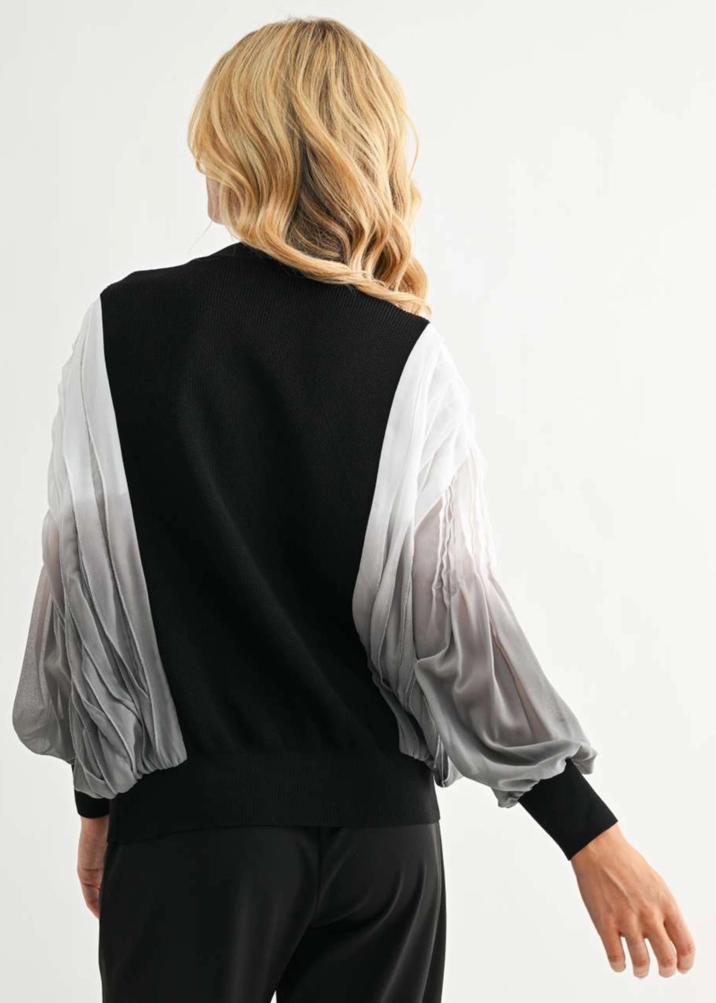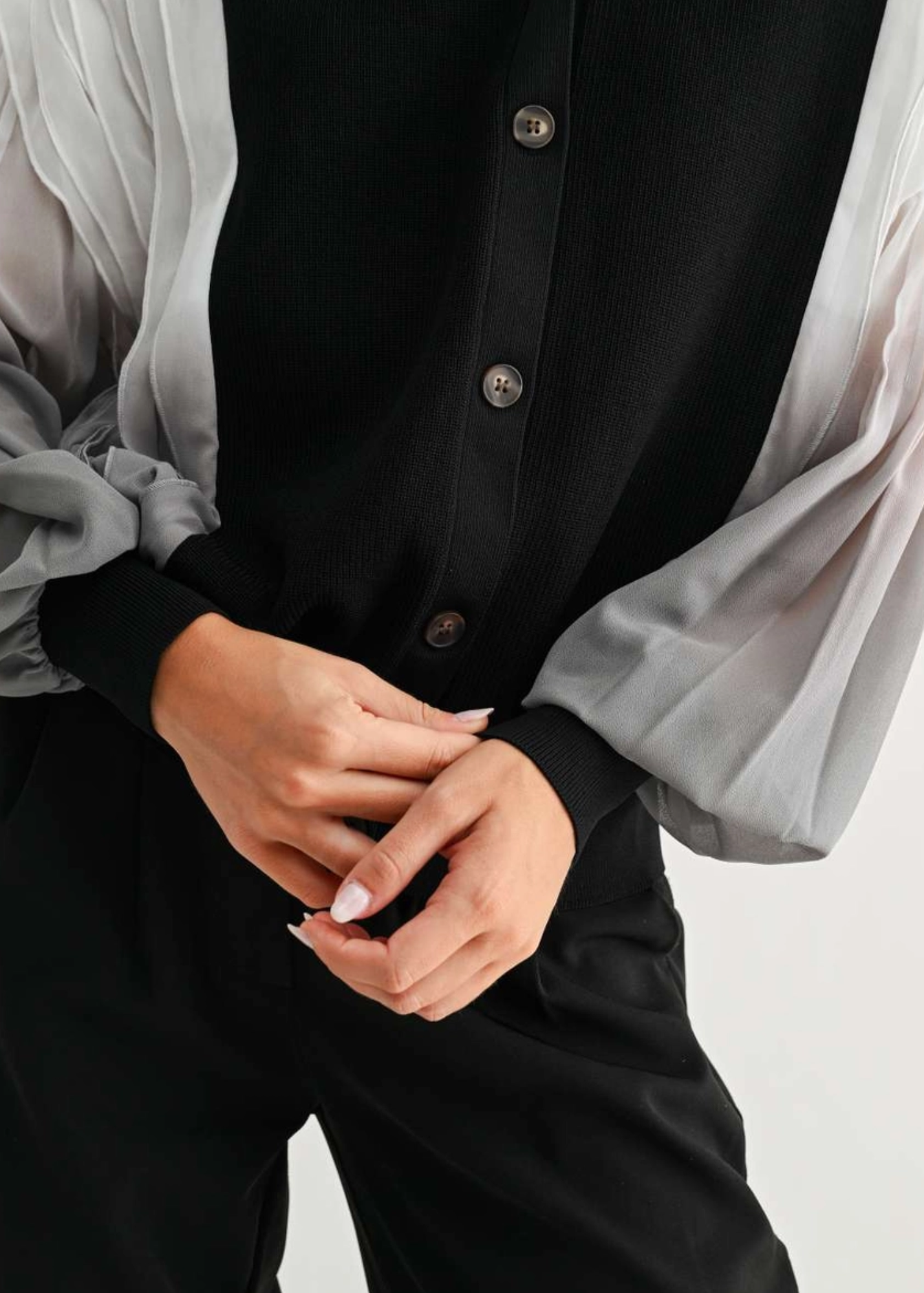 The Simon Cardigan is a modern knit cardigan featuring a sleek black body with a flattering V-neckline and button-front closure. Designed with soft, semi-sheer ruffle pleated sleeves in a white-to-gray gradient for added texture and contrast. Finished with ribbed cuffs and hem for a clean, polished look that’s easy to dress up or down.