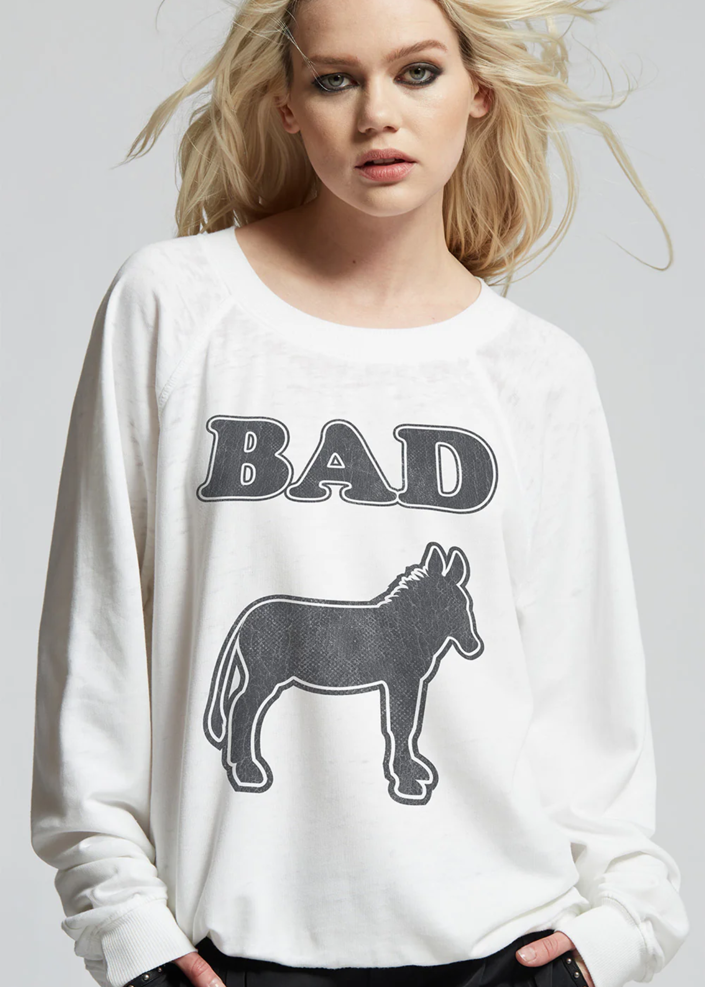 Featuring bold, distressed BAD and a playful donkey graphic, this super soft, vintage-washed sweatshirt is designed with a relaxed crew neckline, ribbed hems, and our popular oversized fit in vintage blue.