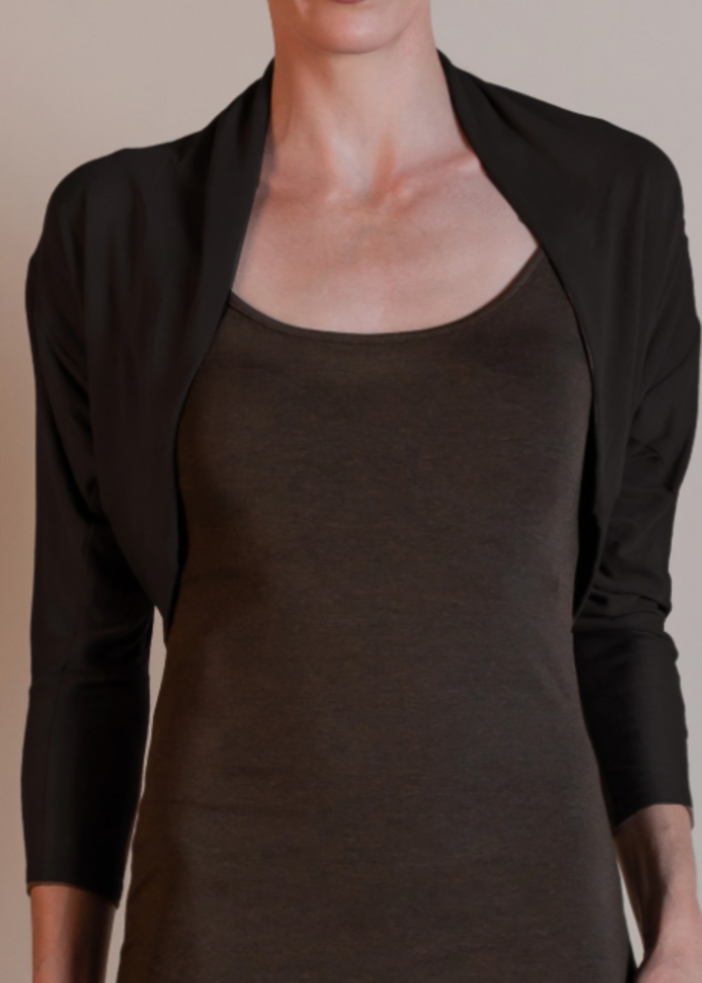 An easy coverup for the slightly chilly day or evening, this shrug can go from day to night. Made of soft knit crepe.