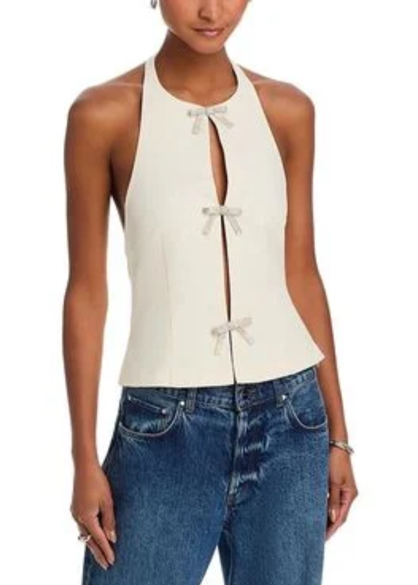The JUVIA features a sleek halter design that elegantly contours the neckline. Its refined bow detail adds a subtle statement of sophistication, making this top a versatile choice for both casual and upscale settings. Crafted to enhance your silhouette, the top merges style with expert tailoring for a polished look.