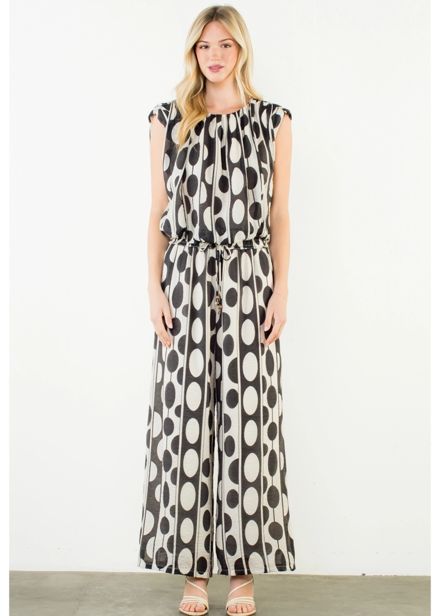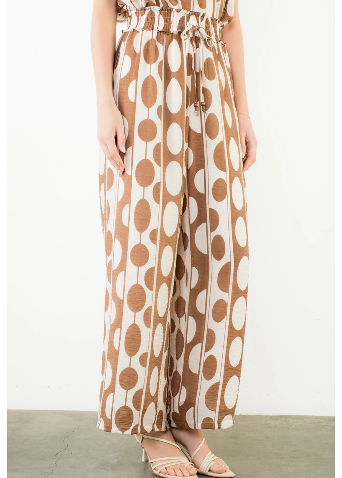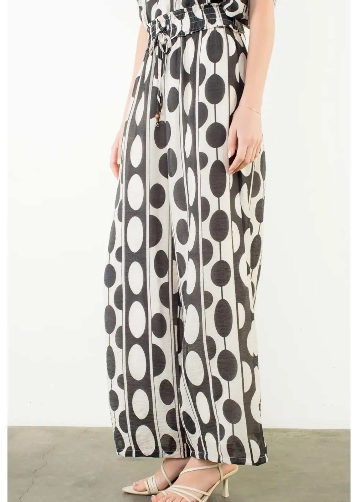 Oval Dot Smocked Waist Pants . / Style Measurements for Size S / Designed in USA - Body Length: 34 3/4 in - Waist Width: 28 in - Model Sizes - Wearing Size S - Height 5' 9", Bust 32", Waist 25 1/2", Hips 36" WOVEN / 71% Rayon, 29% Nylon