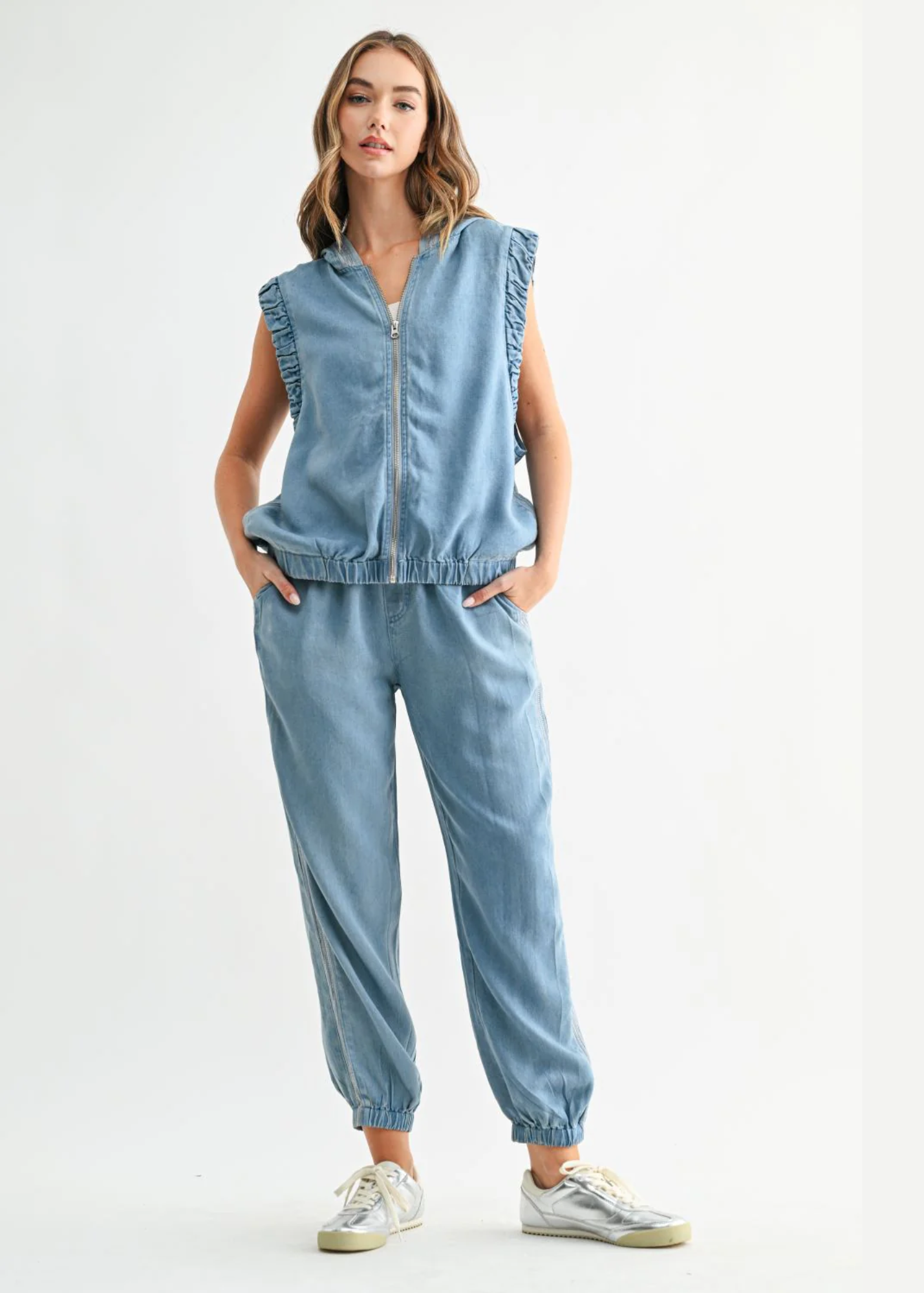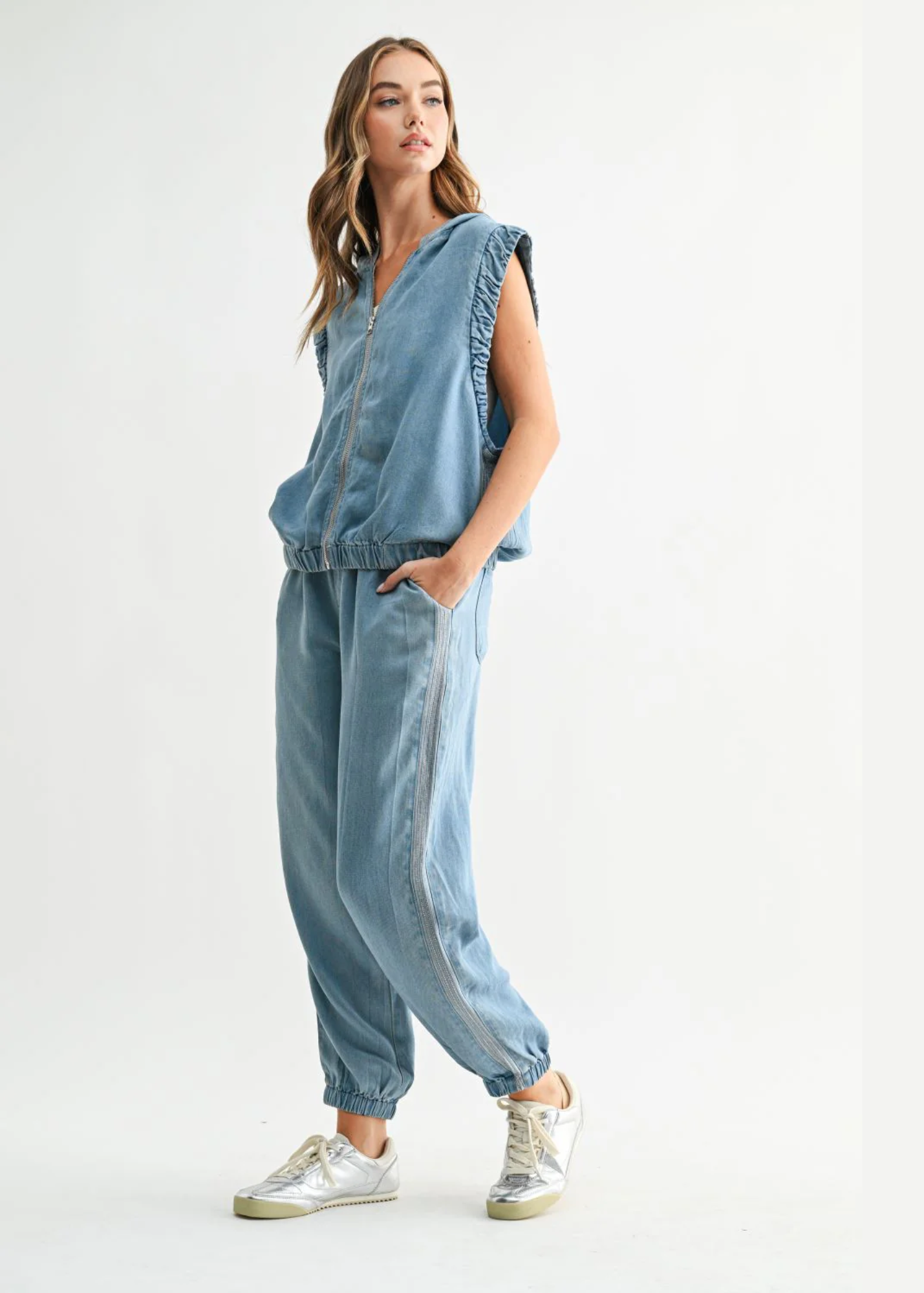 Relaxed straight-leg jogger pants in matching soft denim with an elastic waistband and cuffed ankles for a clean, tapered finish. Detailed with a rhinestone trim on the side for a subtle elevated accent. Easy pull-on style with functional pockets, combining comfort and effortless everyday wear.