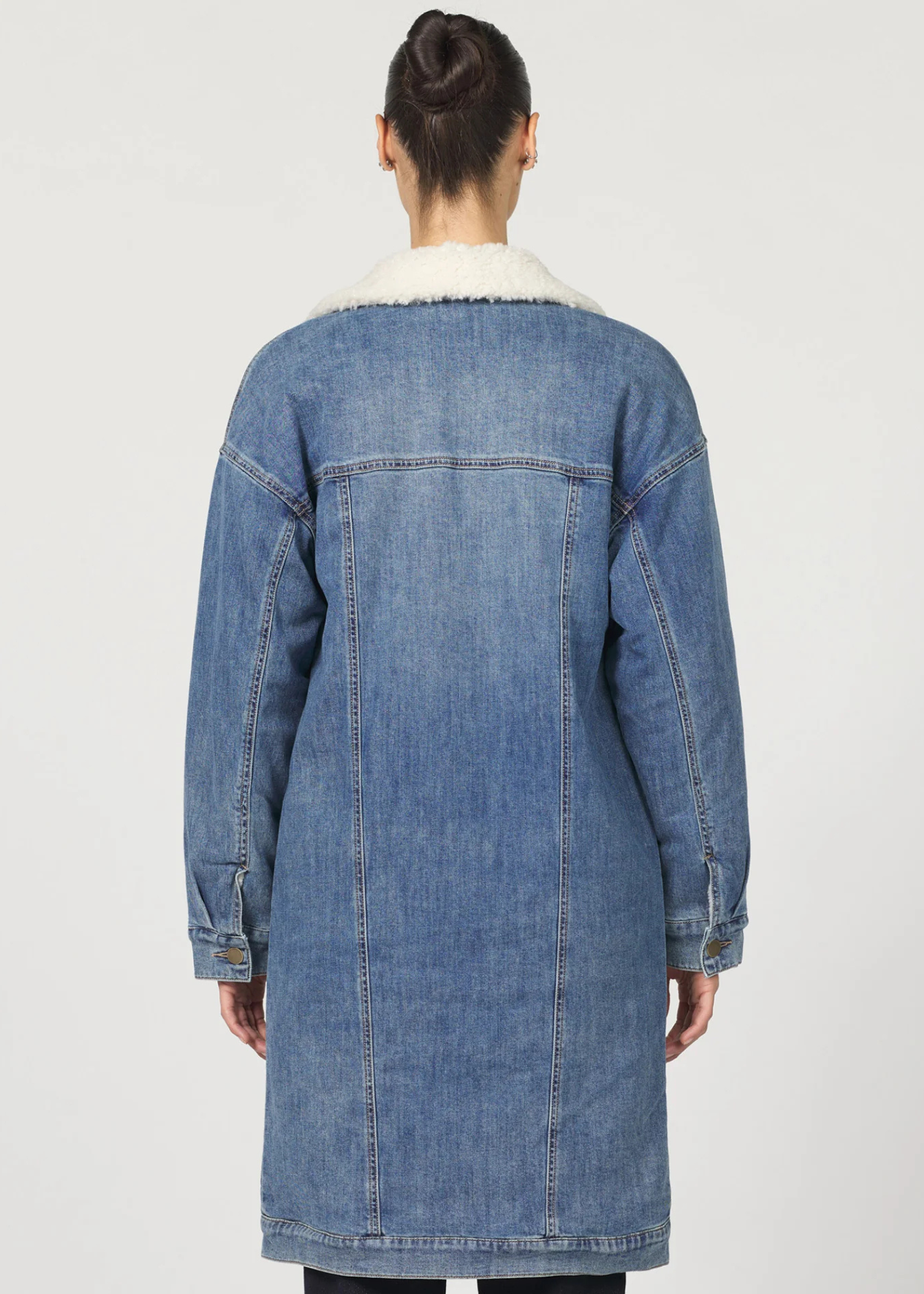 This relaxed denim jacket is made for cozy comfort with its longer length and sherpa lining.