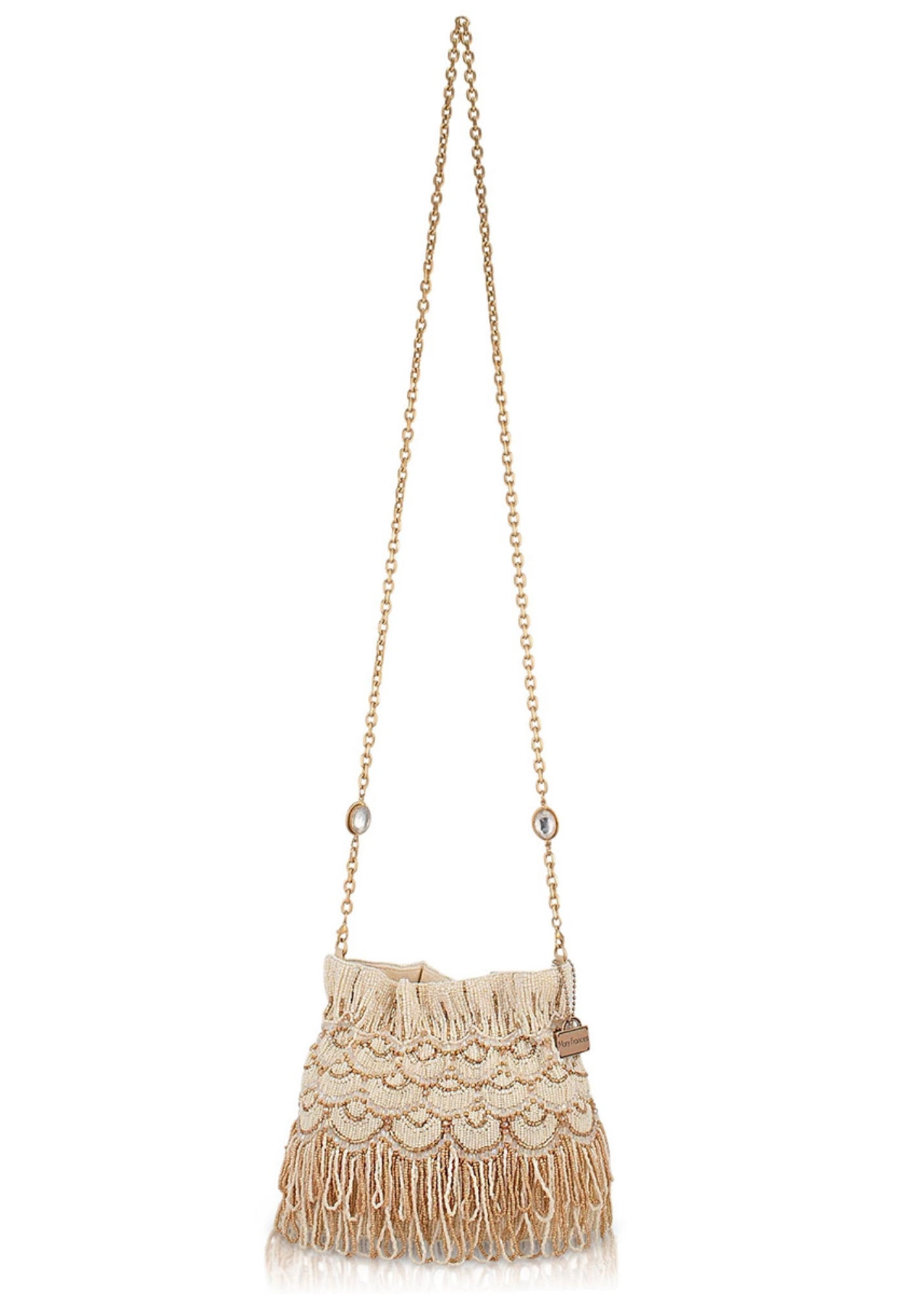 Shimmer and sway with this elegant beaded purse, featuring scalloped details, ombré fringe, and a luxe gold chain. It’s the perfect blend of vintage charm and modern sparkle ready to dazzle from day to night.