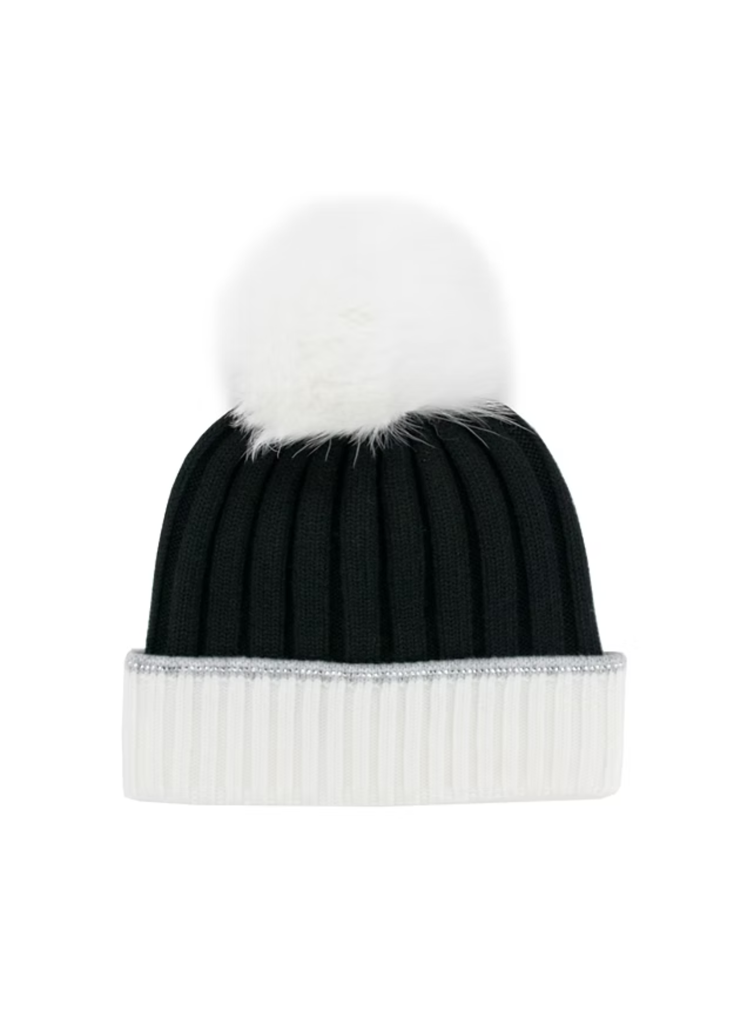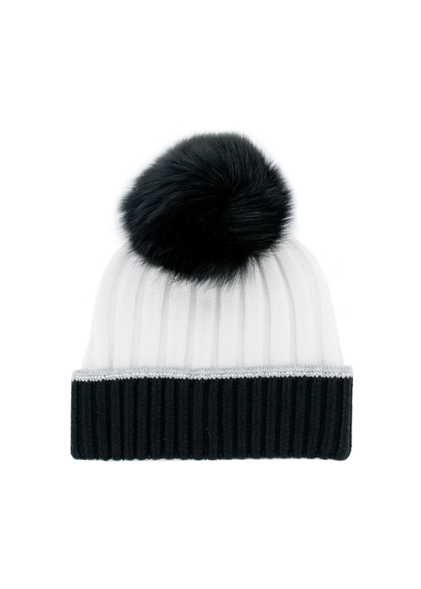 2 TONE BEANIE WITH CRYSTAL BORDER DETAIL & FOX FUR POMPOM