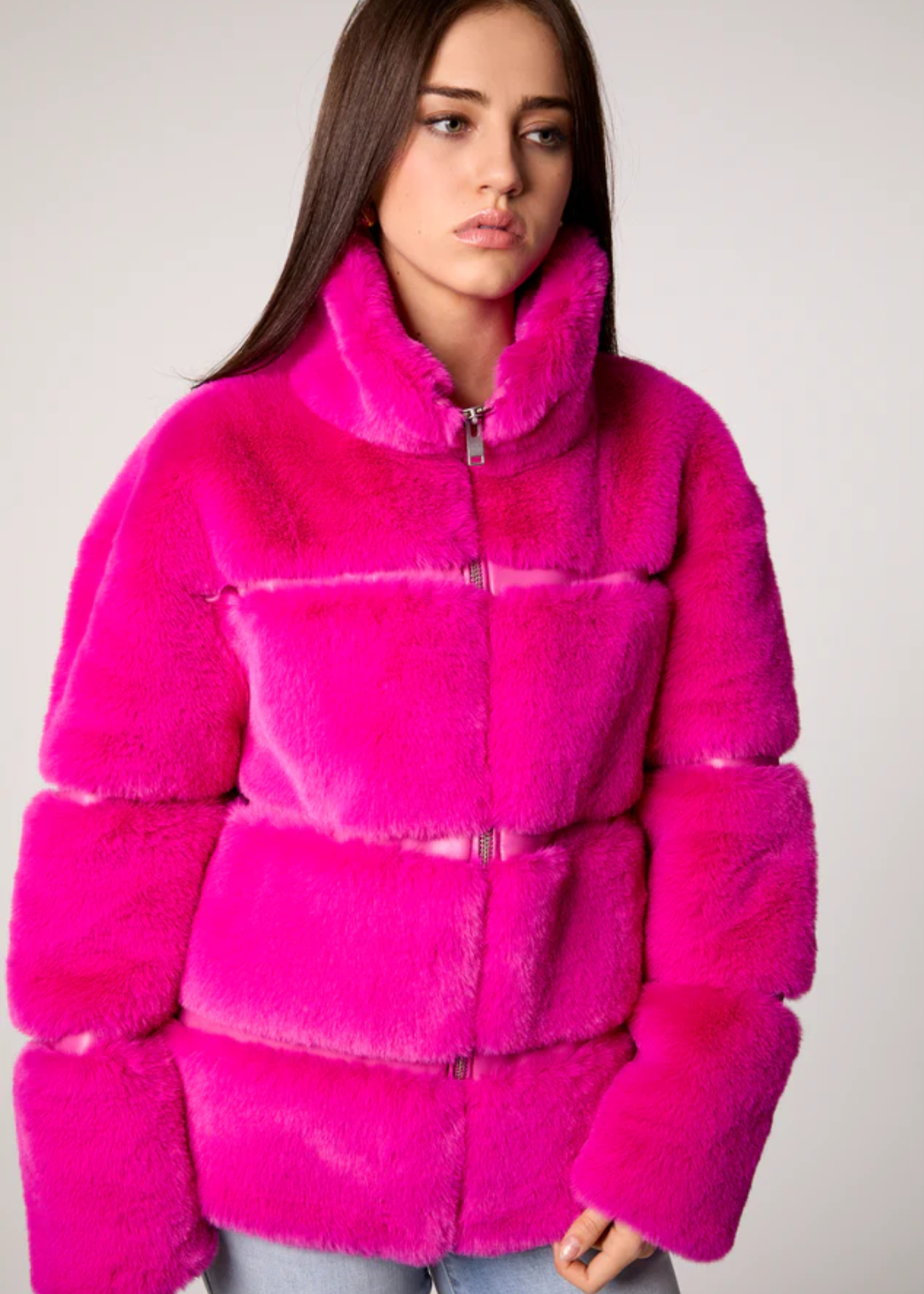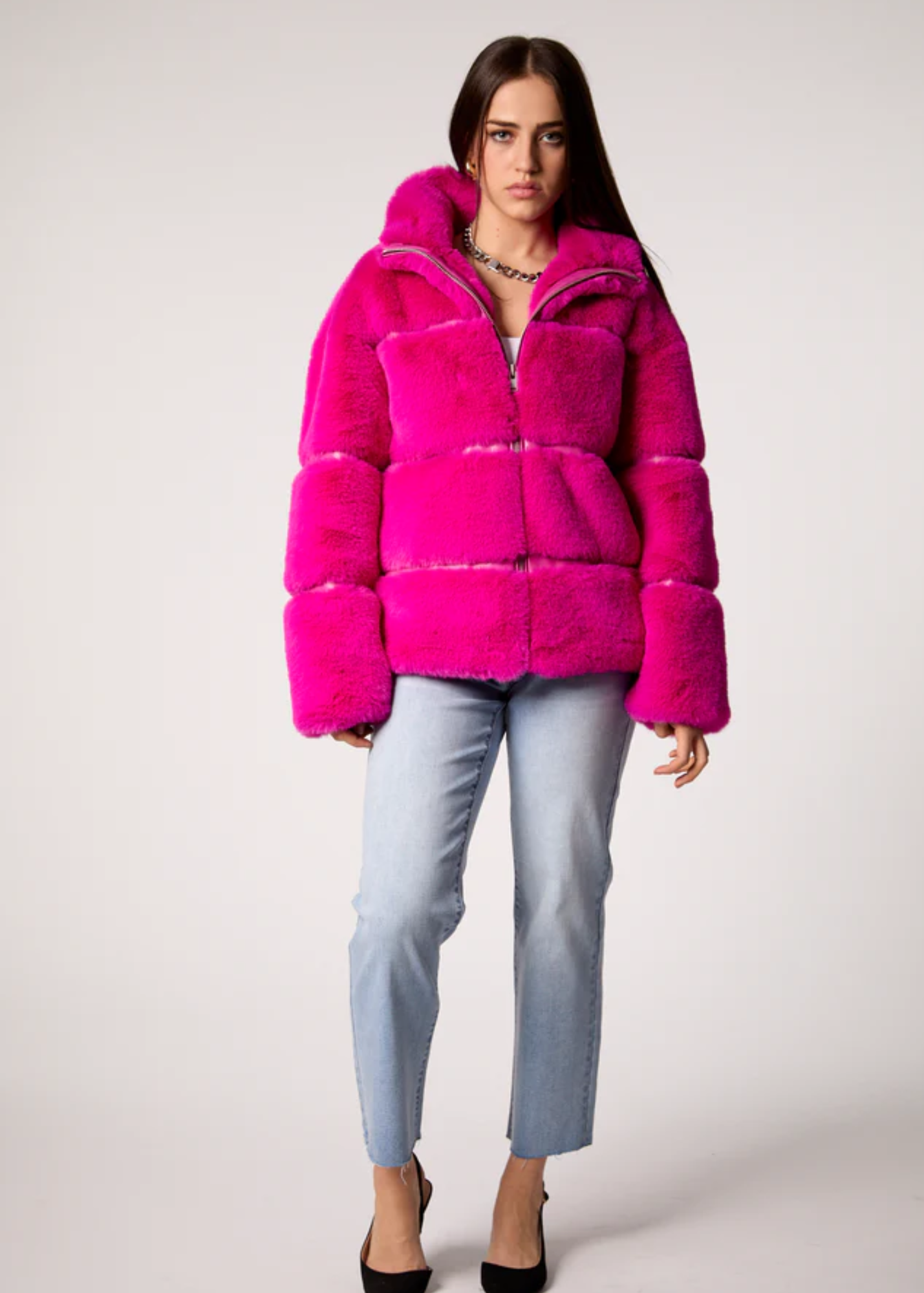 The Mob Wife Jacket features soft faux fur with matte vegan leather. This jacket provides fashionable warmth with functional pockets on each side. Style with our Y2K Bootcut Jean in Monaco for a relaxed but clean look.