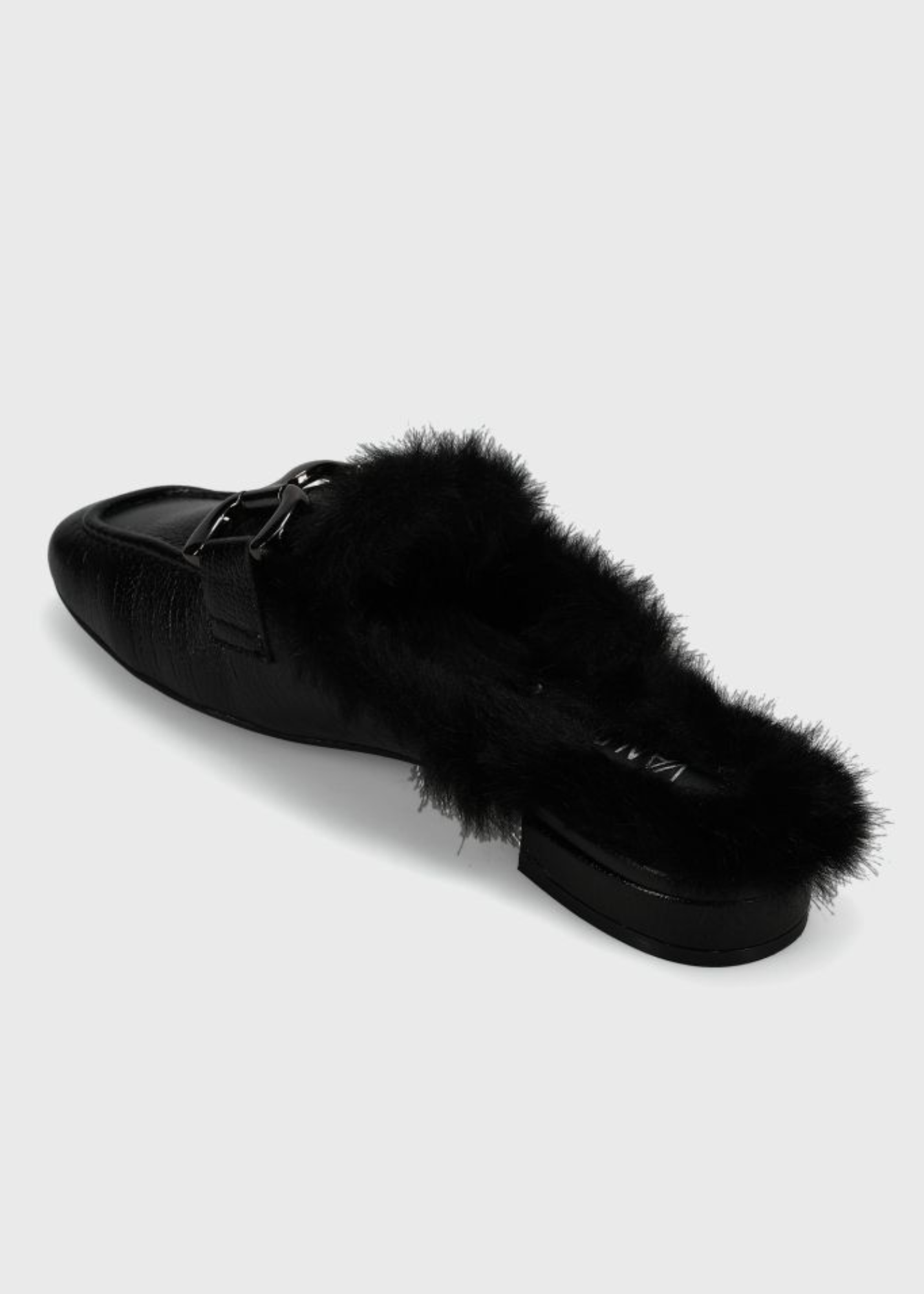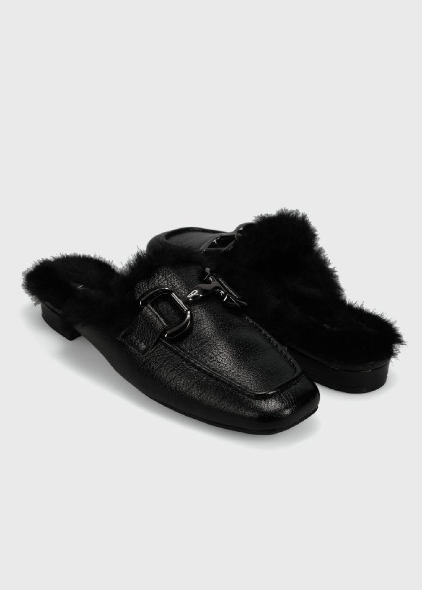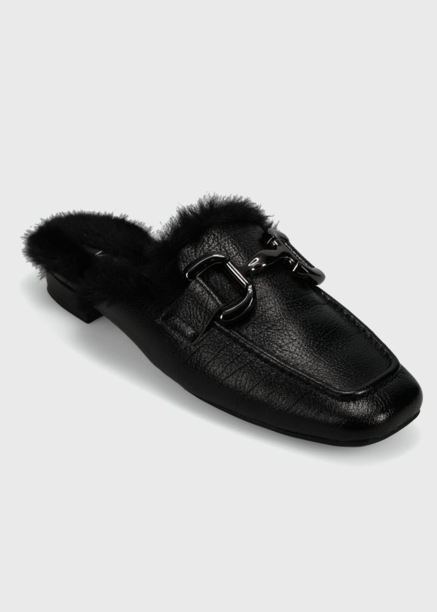 Faux fur-lined loafer mule. Square toe. Apron-style upper. Oversized metal bit. Padded insole. Half-inch covered heel.